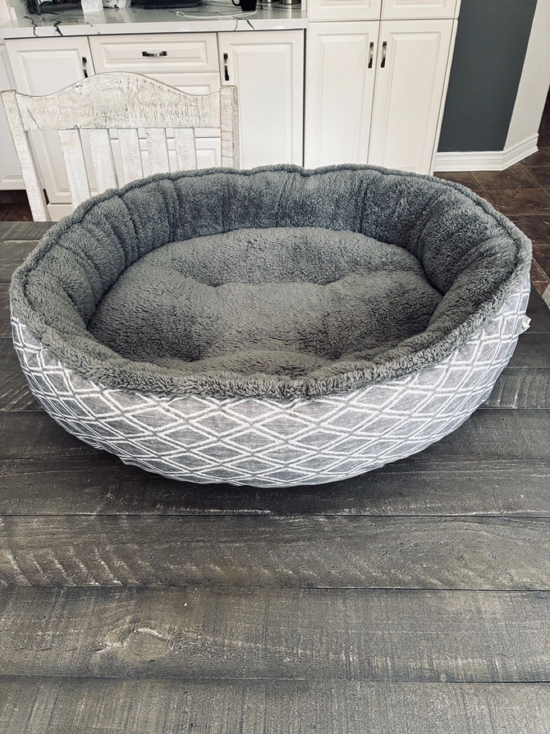 Round pet bed. Soft grey material. Geometric pattern on the sides. Machine washable. 28”. In diameter. Great condition and clean