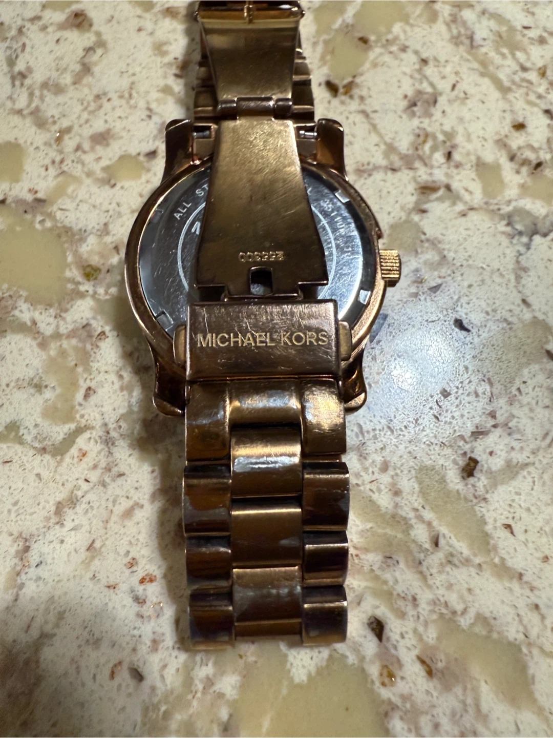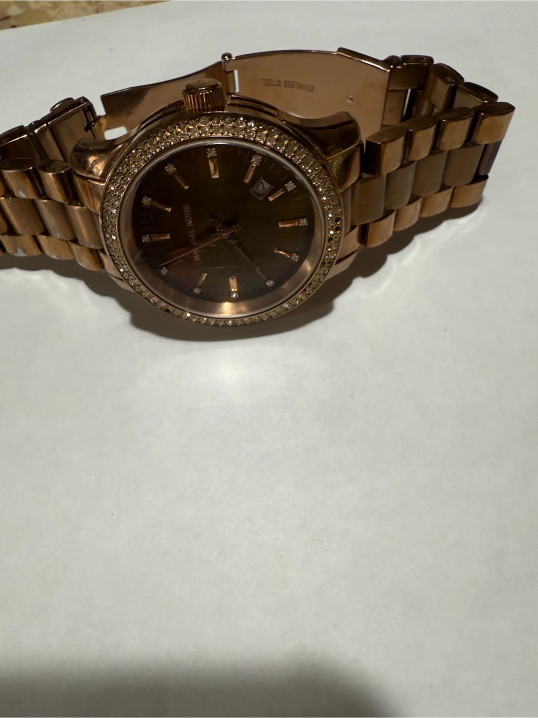 This Michael Kors watch features a rose gold tone and a crystal-embellished bezel. It's made of stainless steel and is water-resistant up to 10 ATM. The watch has a date function visible on the dial.