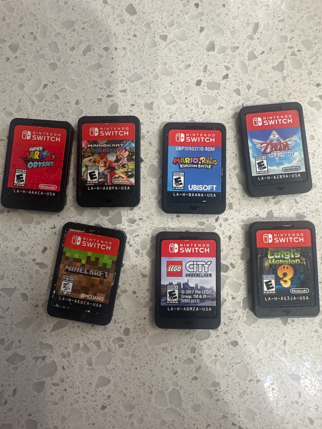 Bundle of seven Nintendo Switch games. Includes Super Mario Odyssey, Mario Kart Deluxe, Mario + Rabbids Kingdom Battle, The Legend of Zelda, Minecraft, Lego City Undercover, and Luigi's Mansion 3. All cartridges are in good condition.🥕