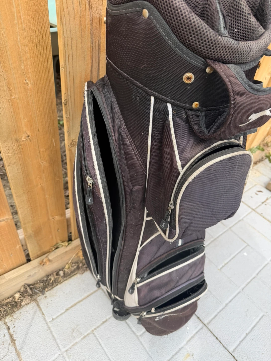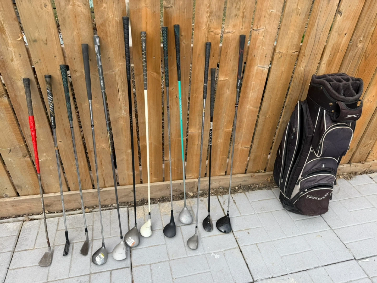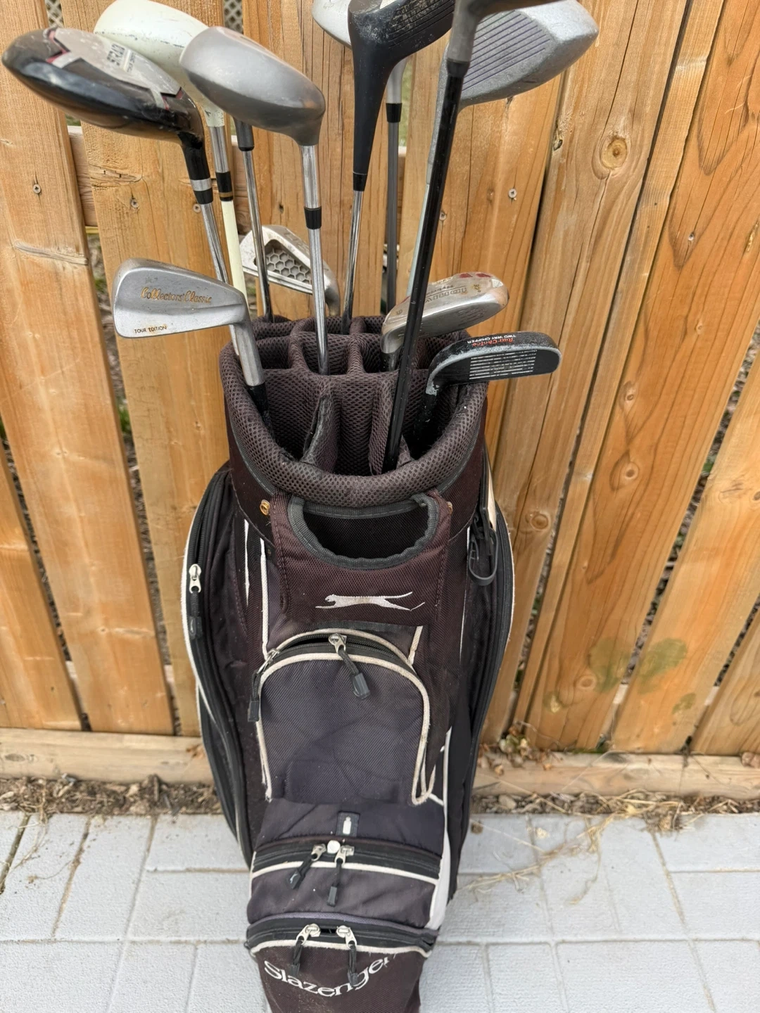 This is a Slazenger golf bag with 11 golf clubs. Includes a variety of clubs with different shaft types and club heads. The bag is black with white trim and features multiple compartments for storage. It's suitable for both beginners and intermediate golfers looking to upgrade their set.