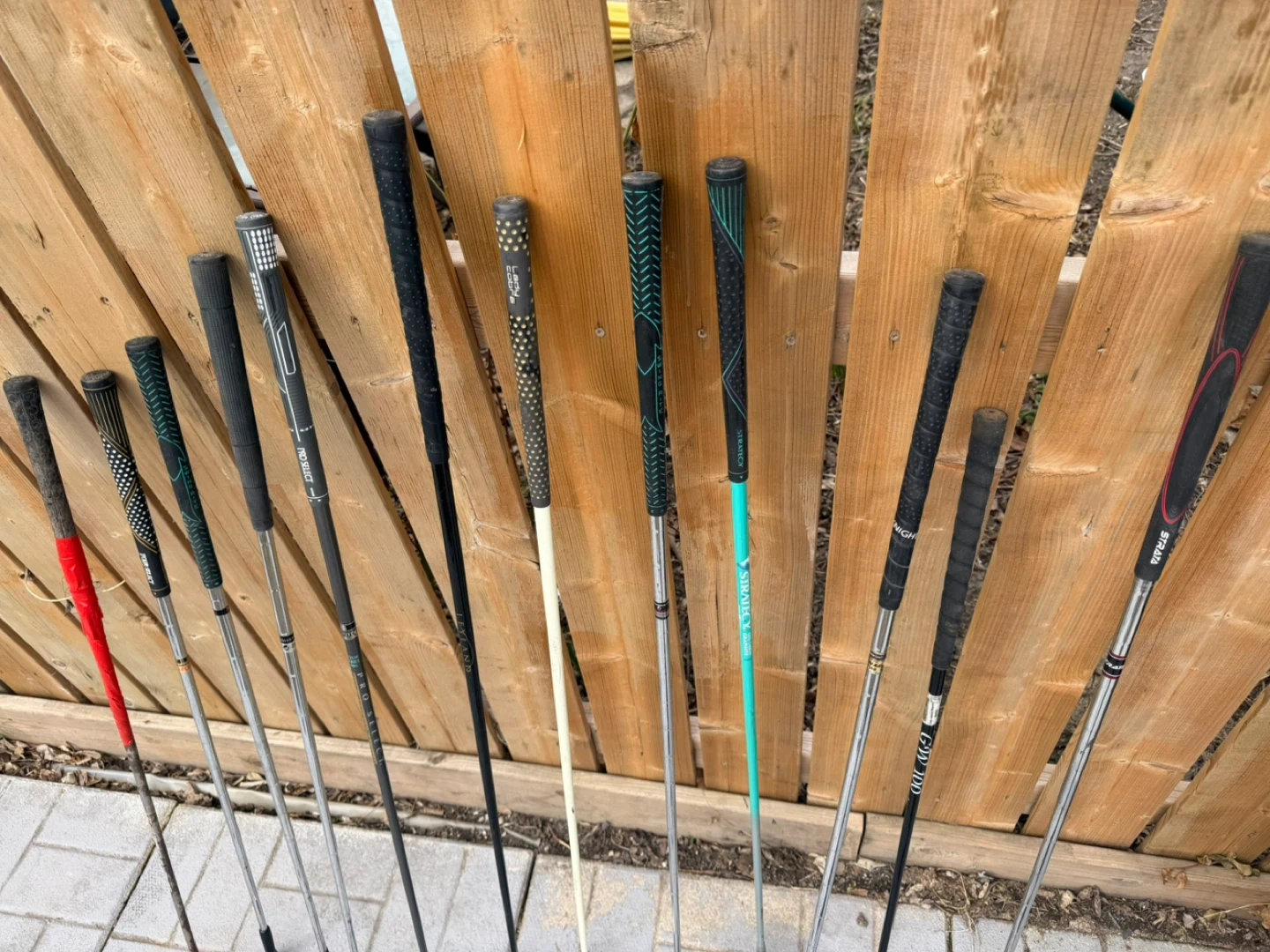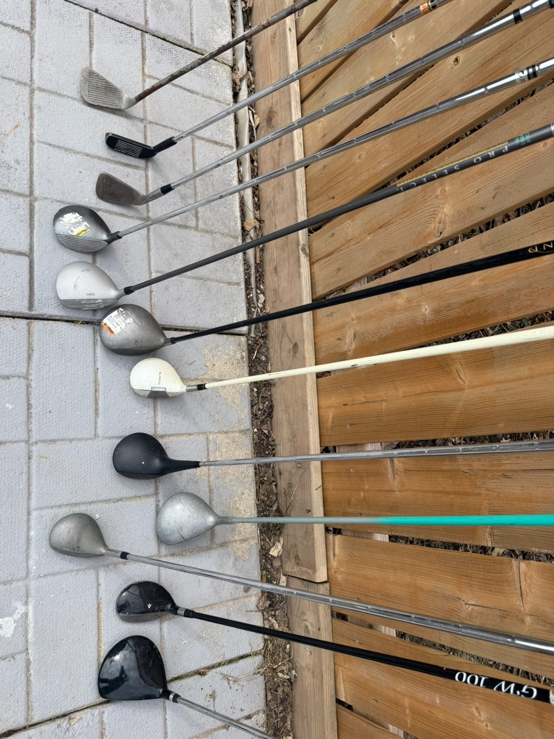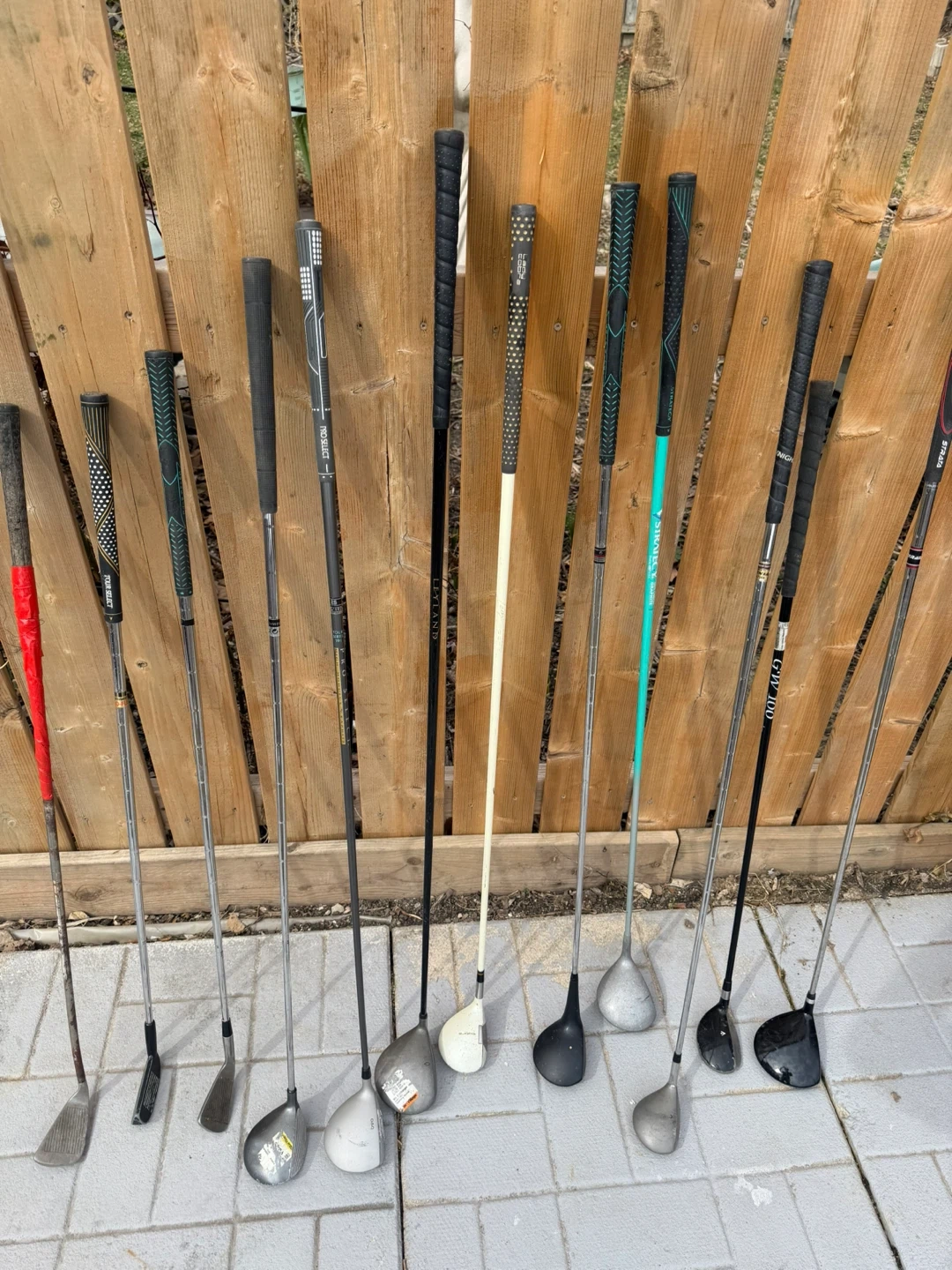This is a Slazenger golf bag with 11 golf clubs. Includes a variety of clubs with different shaft types and club heads. The bag is black with white trim and features multiple compartments for storage. It's suitable for both beginners and intermediate golfers looking to upgrade their set.