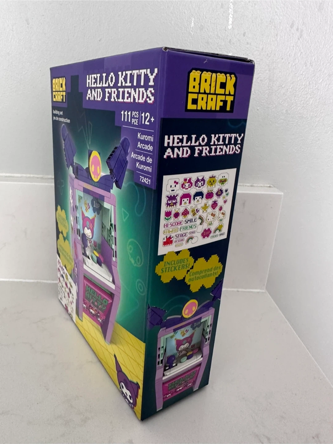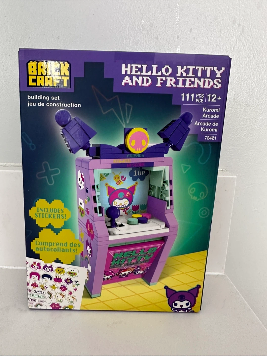 Brand new Brickcraft building set features a Kuromi Arcade from the Hello Kitty and Friends collection. It includes 111 pieces and comes with stickers. Dimensions are 5.9 inches (15 cm) tall by 3.9 inches (9.9 cm) wide.