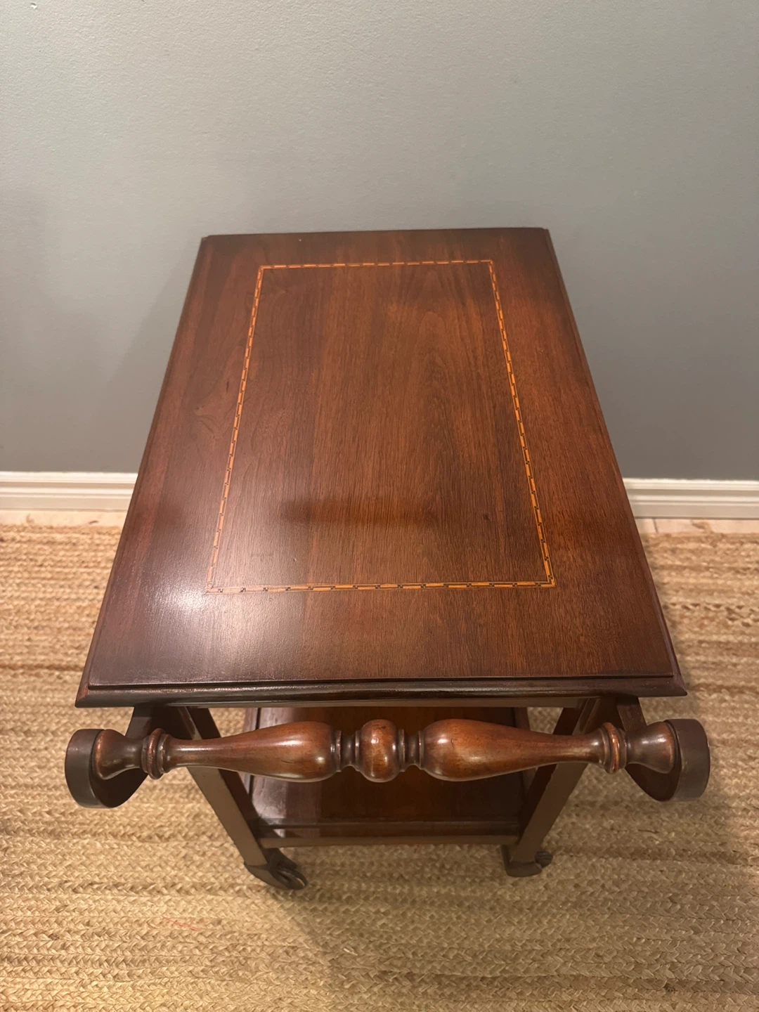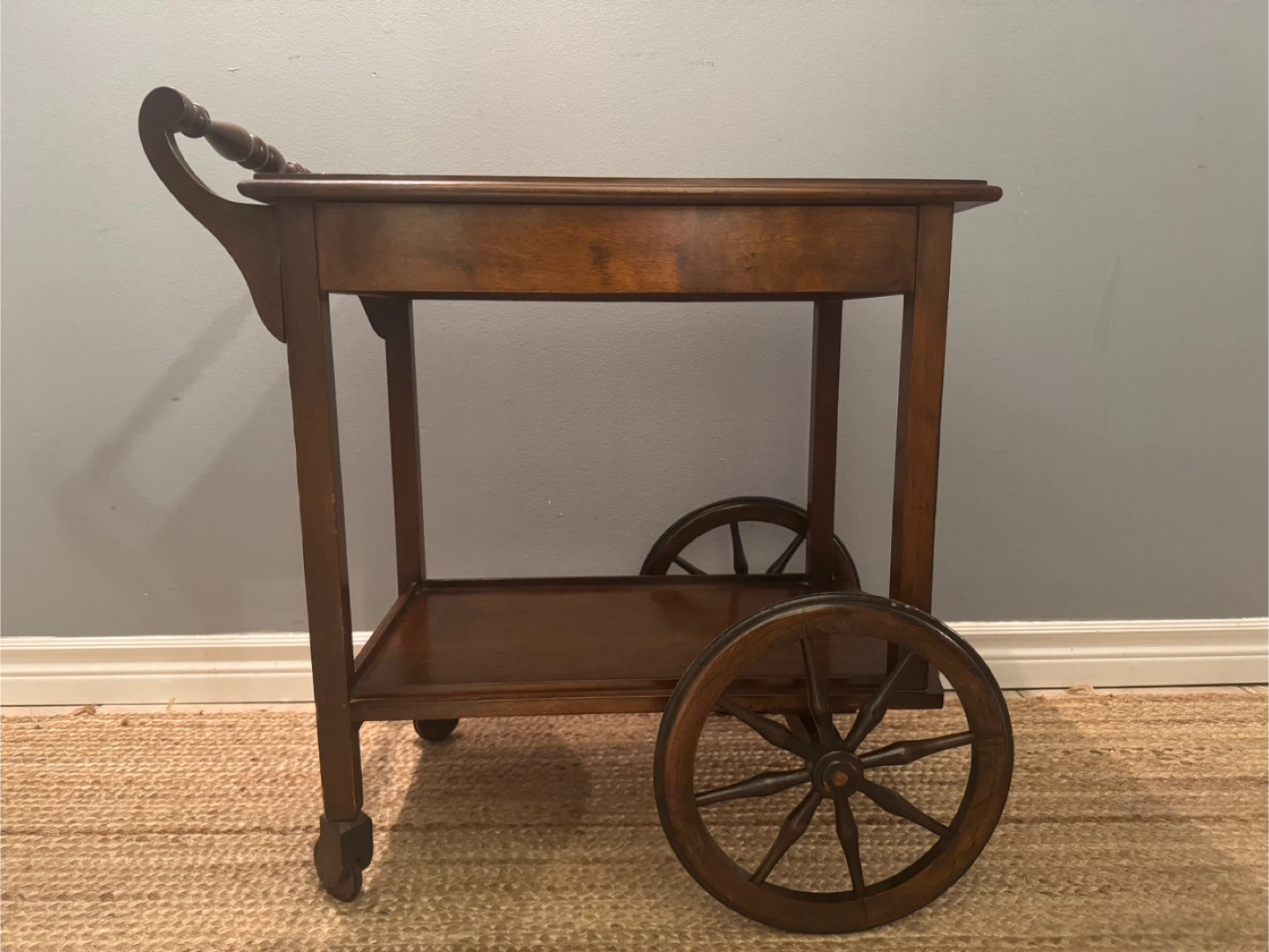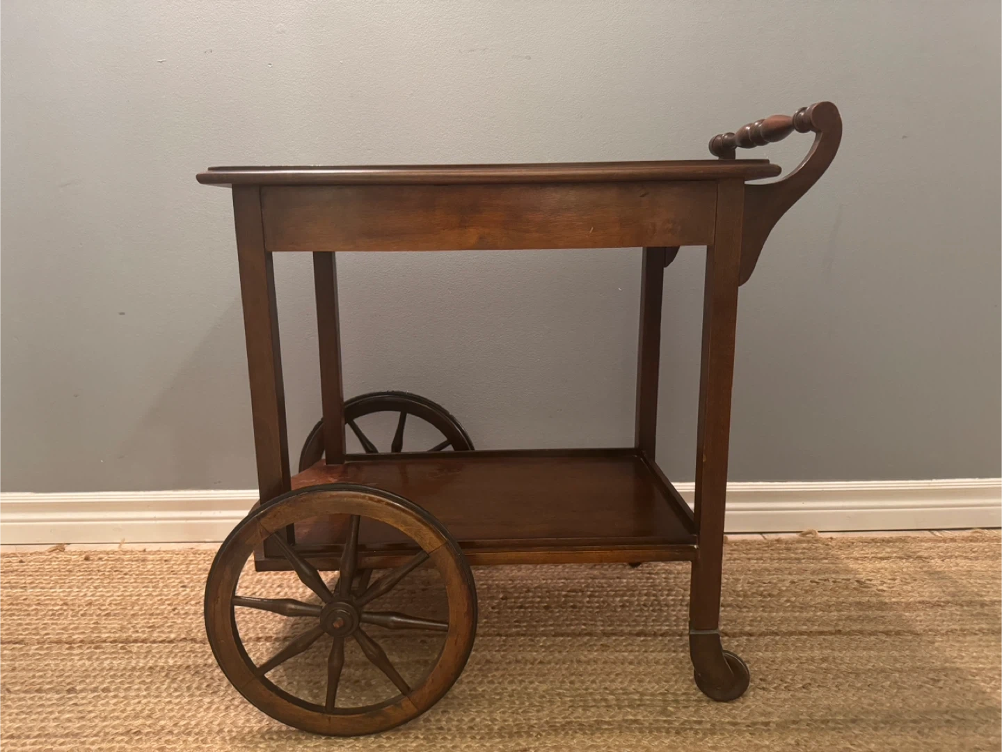 This beautiful wooden serving cart features two tiers and decorative inlay on the top surface. It has large spoked wheels on the back and smaller casters on the front for easy manoeuvrability. The carved wooden handle makes pushing and steering a breeze. It's a stylish way to serve drinks or snacks!