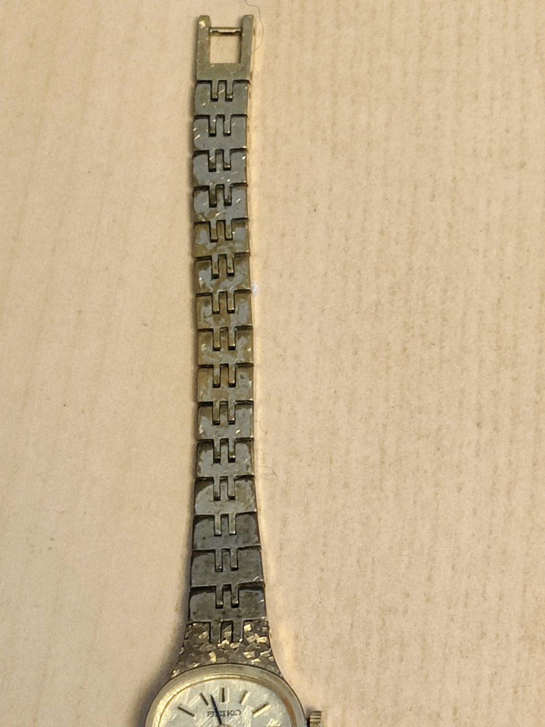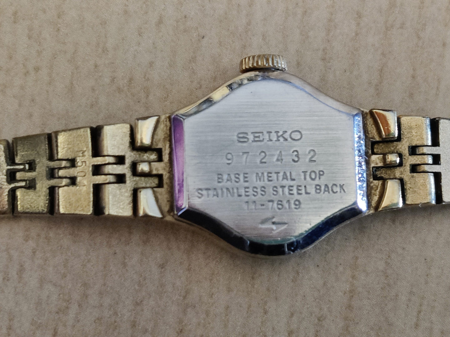 I am selling a Seiko Gold Dial Stainless Steel Ladies / Women Watch in used, tested, and working condition with No Battery Required. This is a manual winding watch where you need to manually wind the crown on a daily basis. Model 972432 / 11-7619. Stainless steel back with a stainless steel bracelet. Gold dial with black-toned hands and gold index markers at every o'clock position. Dial Type: Analog. Pull/push crown. Oval case shape. Jewelry clasp. Dress watch style. Made in Japan.