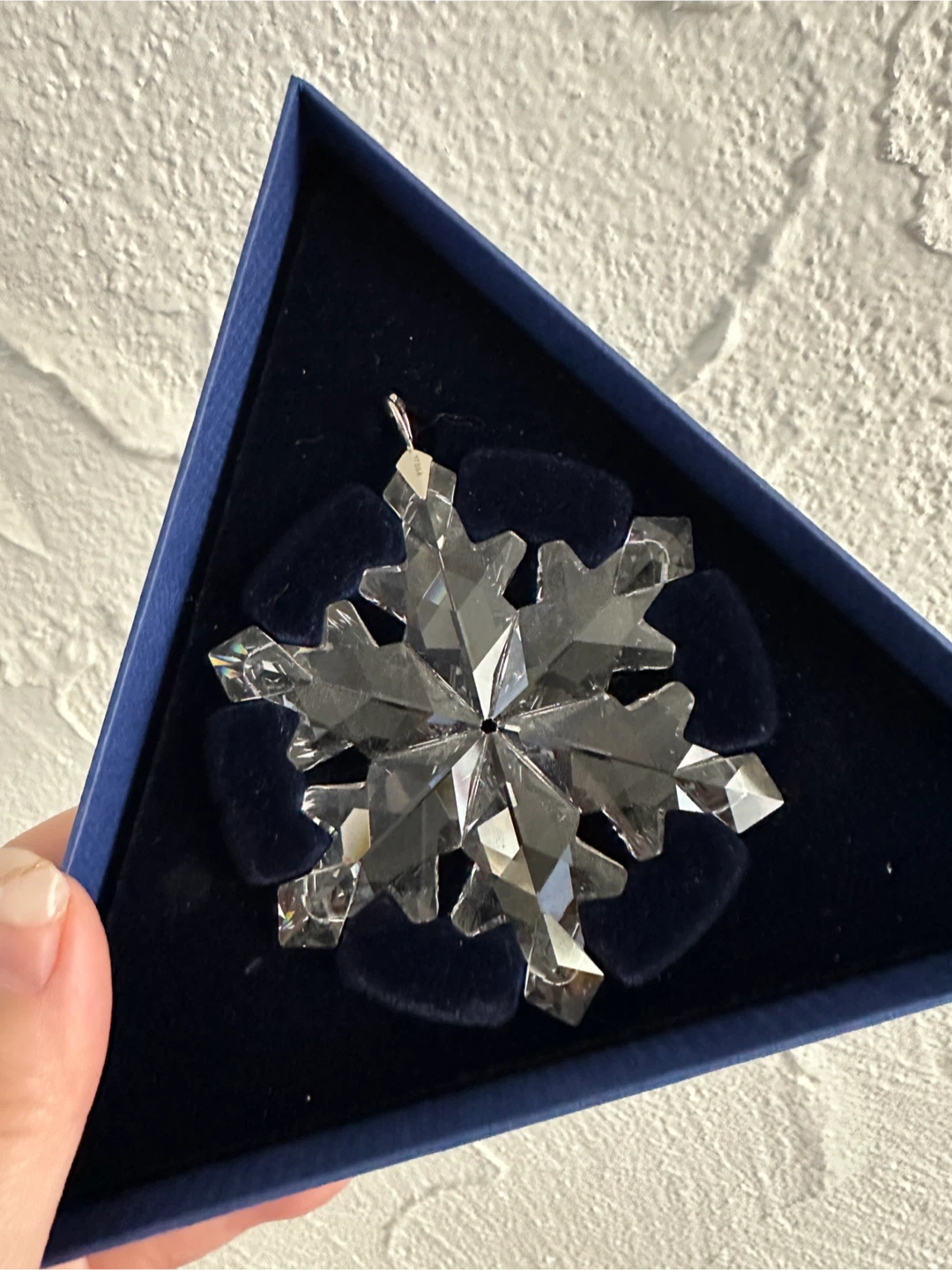 Sparkling Swarovski crystal snowflake ornament. Includes original blue velvet-lined box. It's a beautiful addition to any holiday decor!