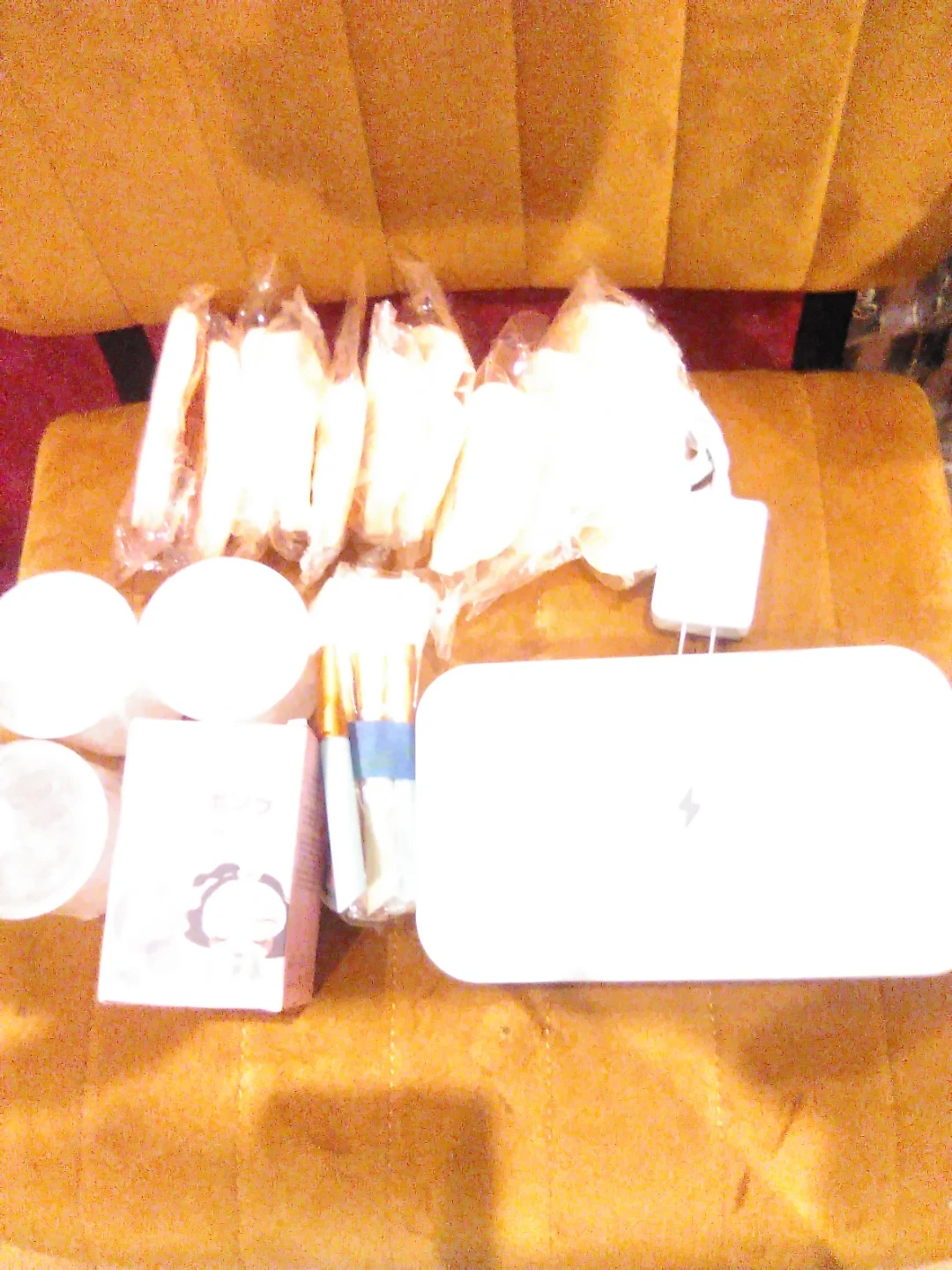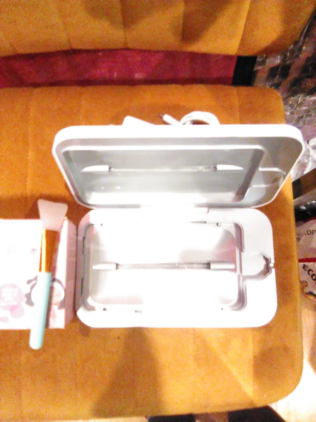 This is a PhoneSoap Model No. 500-1 UV sanitizer. It comes with a charging adapter. Includes a spatula and some other small accessories.