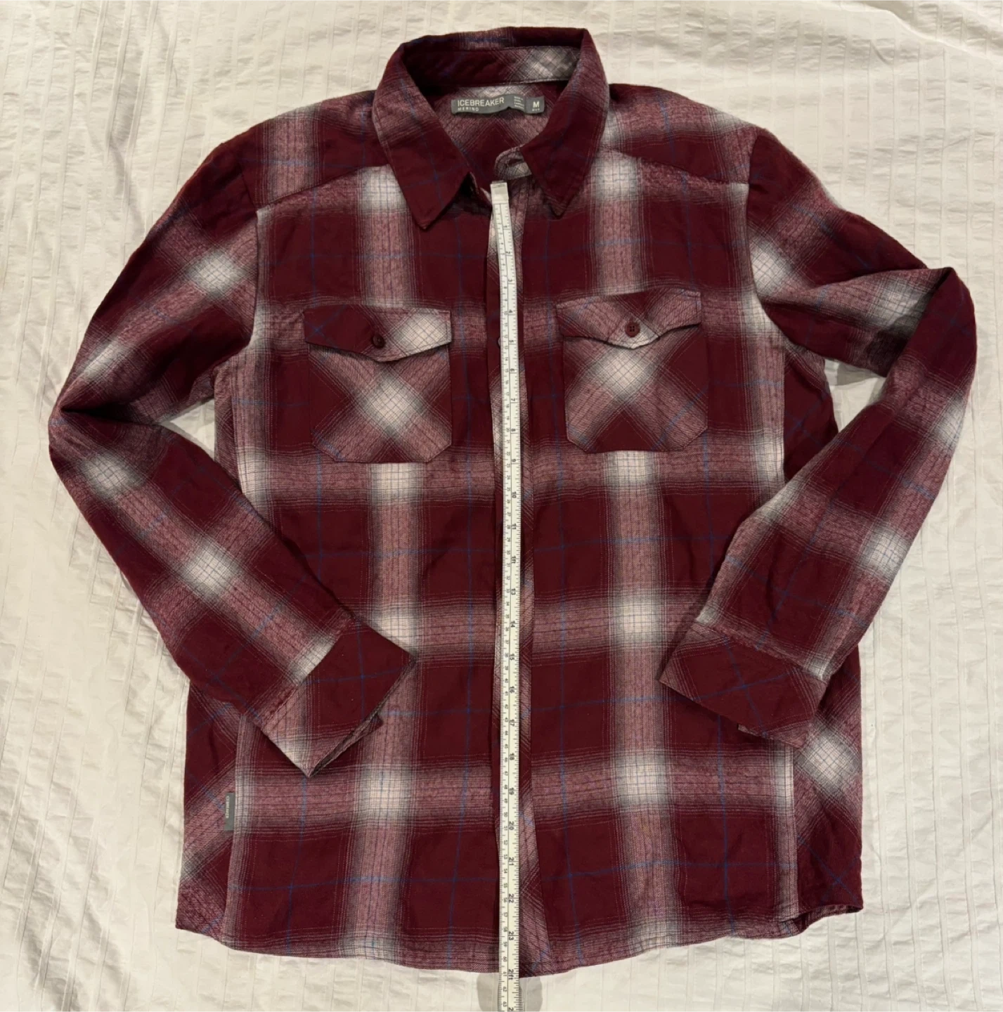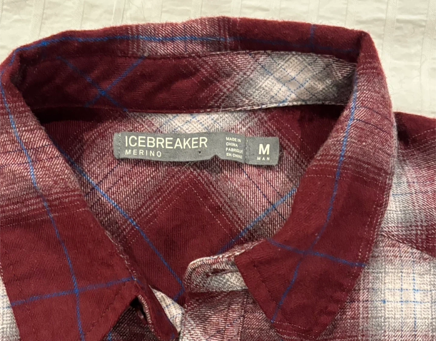 Icebreaker merino wool flannel shirt for men. It's a size medium in a classic plaid pattern. This shirt is great for layering during cooler weather.