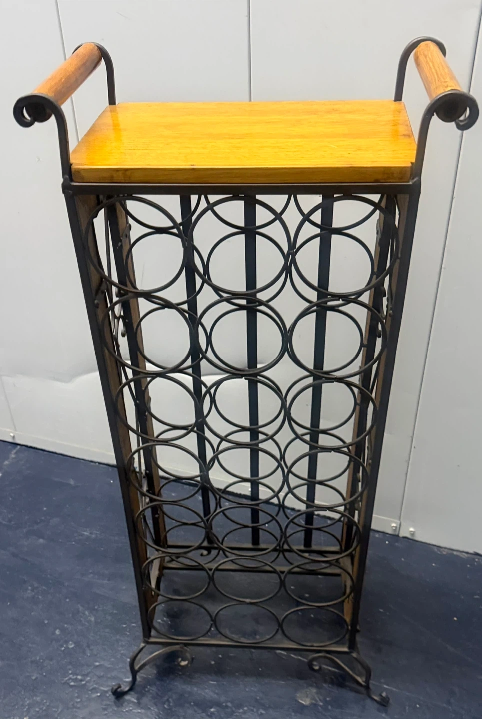 This tall wine rack holds up to 20 bottles. It's made of black metal with wood accents and a wooden top. The decorative metalwork adds a nice touch.