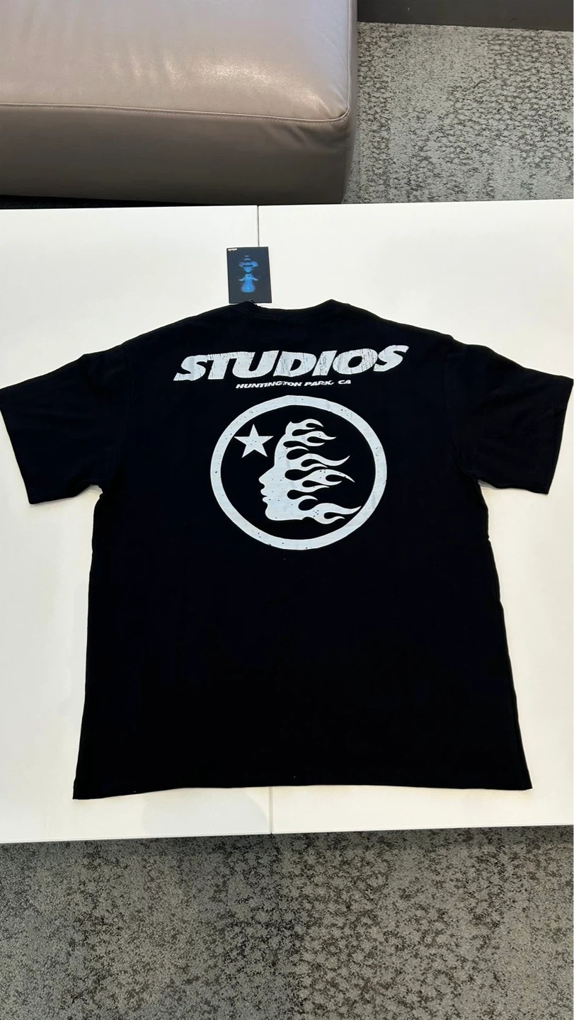 Black t-shirt with Studios graphic on front and back. 100% cotton. Huntington Park, CA.