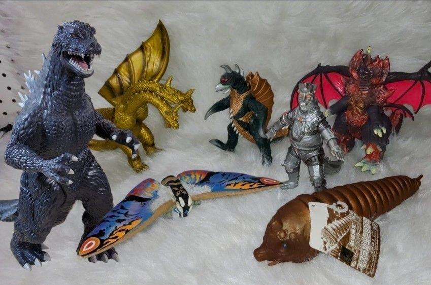 Huge collection of vintage Godzilla monsters, mostly from the 90s. All of them are in great condition and ready for all your fun purposes. Includes a large 12-inch Godzilla Final Wars figure (one piece from the 2020s), Bandai King Ghidorah, Bandai Male Mothra Larva (with tag), Bandai Destroyah, Gigan, Bandai MechaGodzilla, and Toho Rainbow Mothra. Let me know if you're interested!