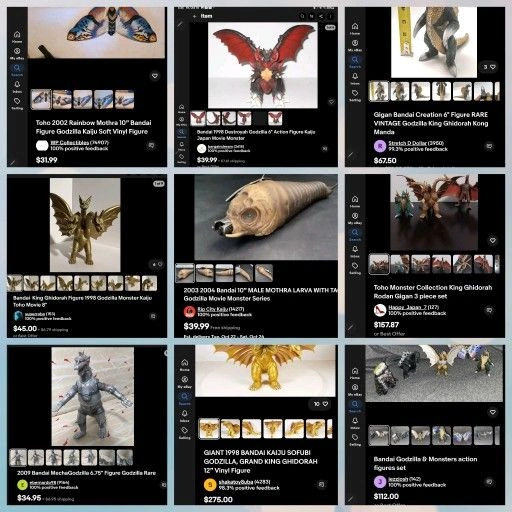 Huge collection of vintage Godzilla monsters, mostly from the 90s. All of them are in great condition and ready for all your fun purposes. Includes a large 12-inch Godzilla Final Wars figure (one piece from the 2020s), Bandai King Ghidorah, Bandai Male Mothra Larva (with tag), Bandai Destroyah, Gigan, Bandai MechaGodzilla, and Toho Rainbow Mothra. Let me know if you're interested!