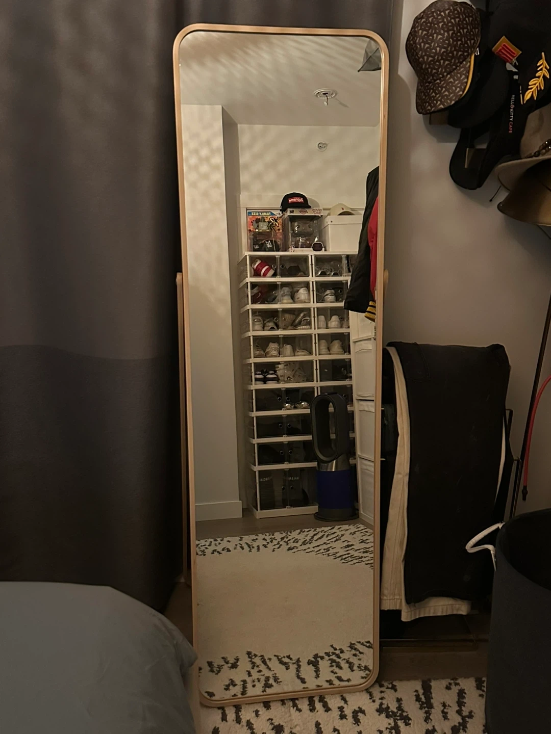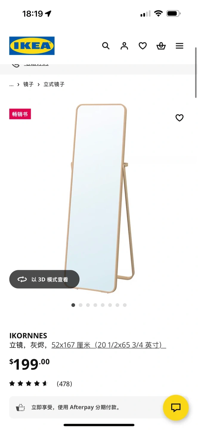 This is an IKEA IKORNNE mirror. It's 52x167 cm (20 1/2x65 3/4 inches). The frame is a light wood colour. It's a standing mirror with a built-in easel stand. This mirror is great for checking outfits before heading out!