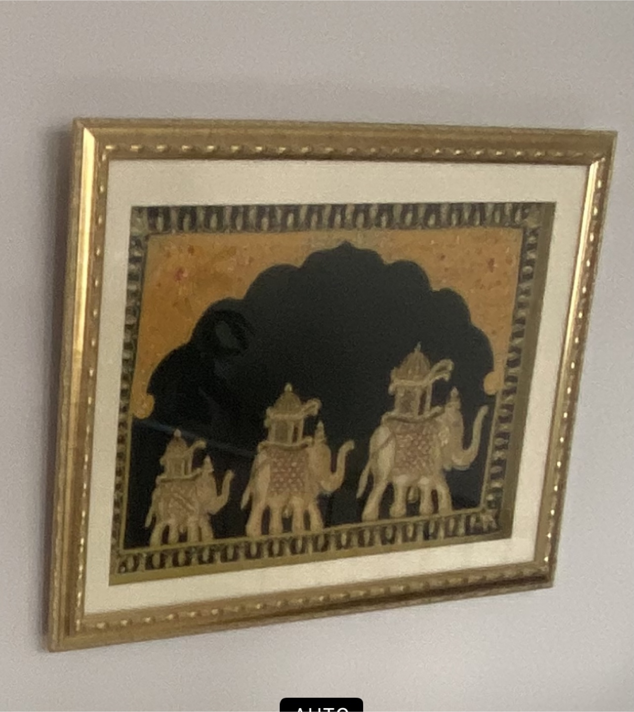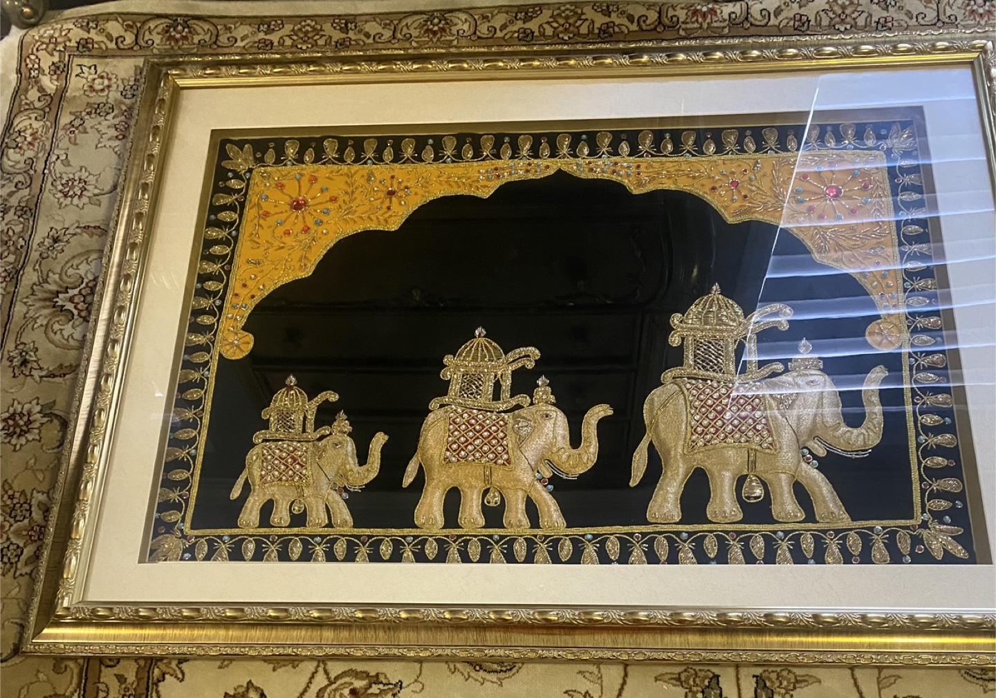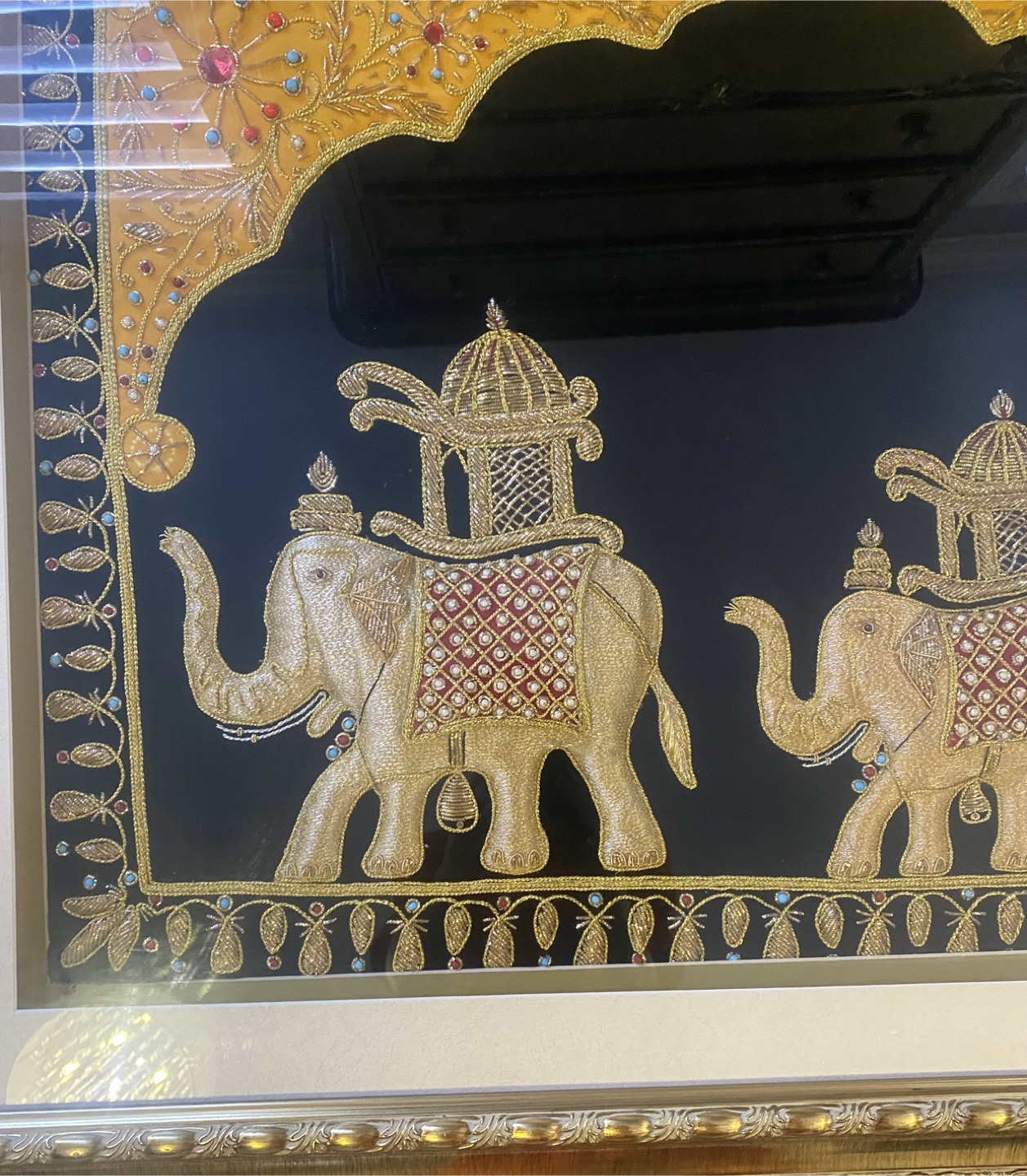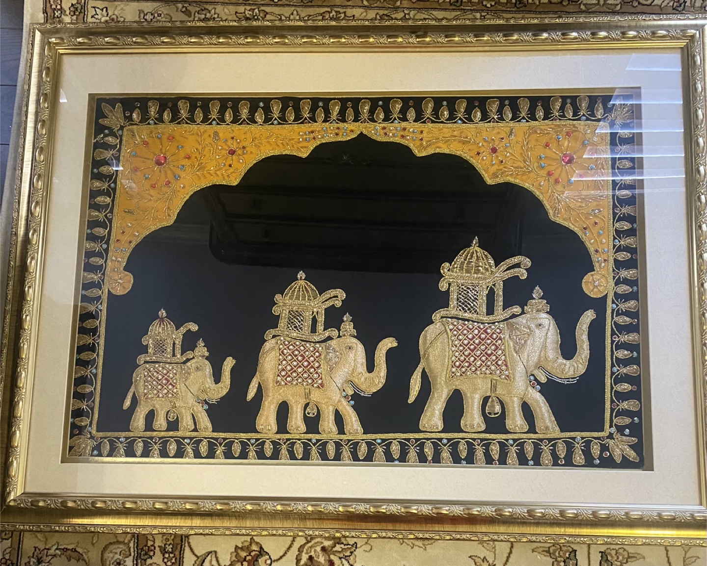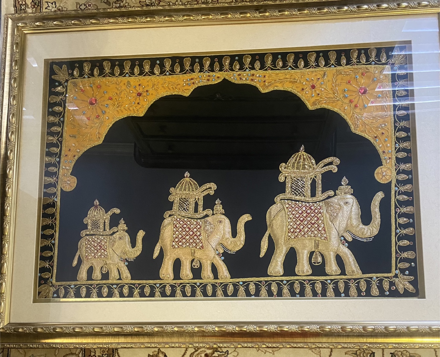 Beautiful framed embroidery art featuring elephants. The frame is gold-toned and the artwork has intricate detailing