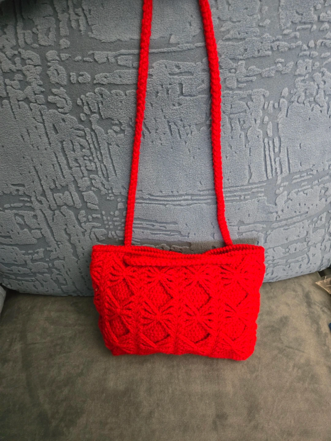 handmade crochet purse in a beautiful red colour. Has a diamond pattern throughout. The braided straps are sturdy, comfortable and allow the purse to be worn as a crossbody/shoulder purse or a handbag