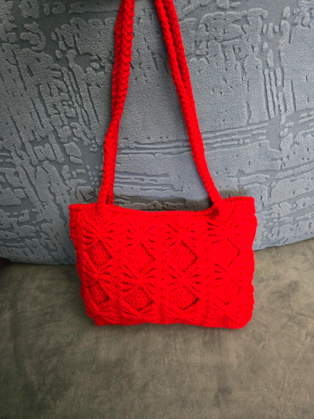 handmade crochet purse in a beautiful red colour. Has a diamond pattern throughout. The braided straps are sturdy, comfortable and allow the purse to be worn as a crossbody/shoulder purse or a handbag