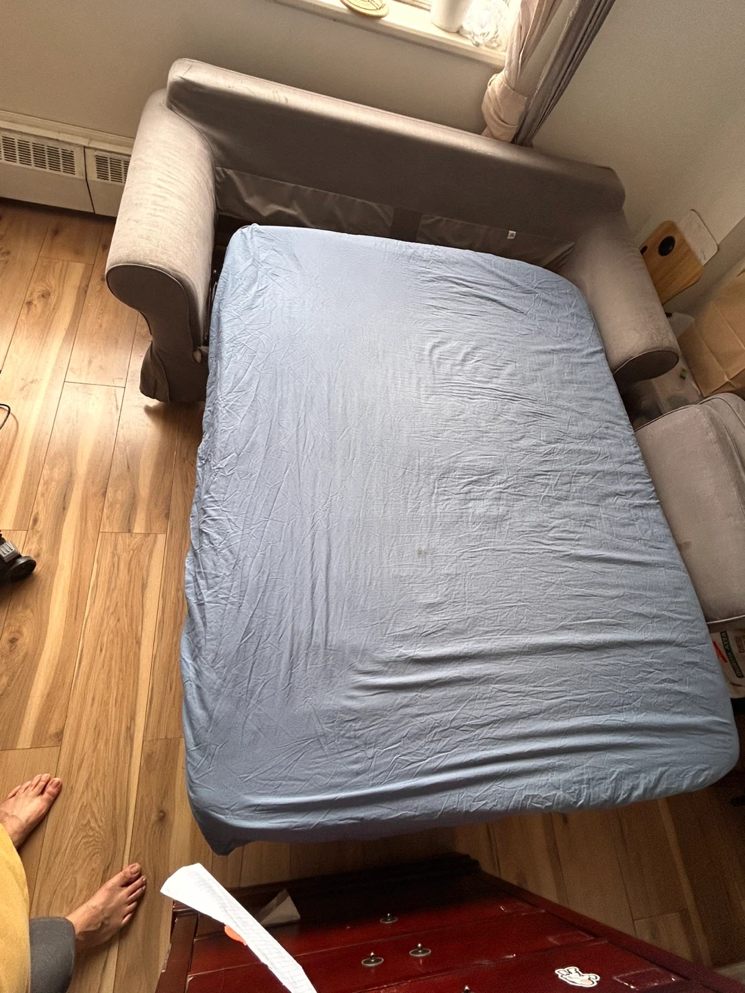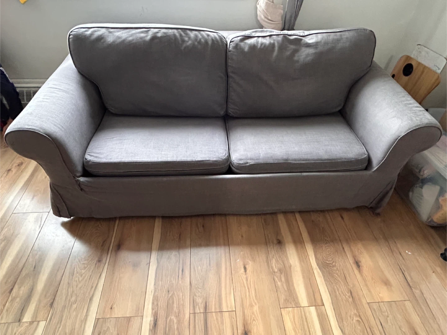 This is a grey sofa bed. It's a comfortable two-seater couch that pulls out into a bed. The mattress is very comfortable and have white protector as well.There is a small defect so selling at throw away price.