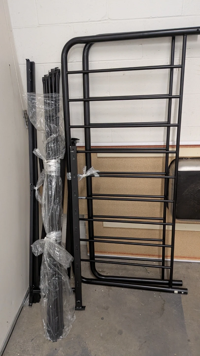 This is a black metal bed frame. It's a twin size and comes unassembled. Constructed from durable metal.