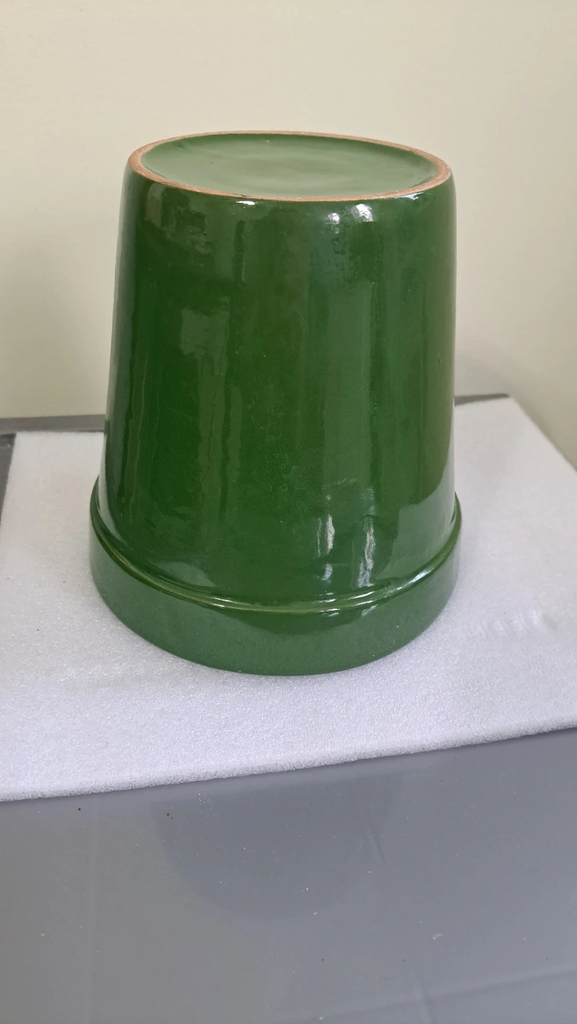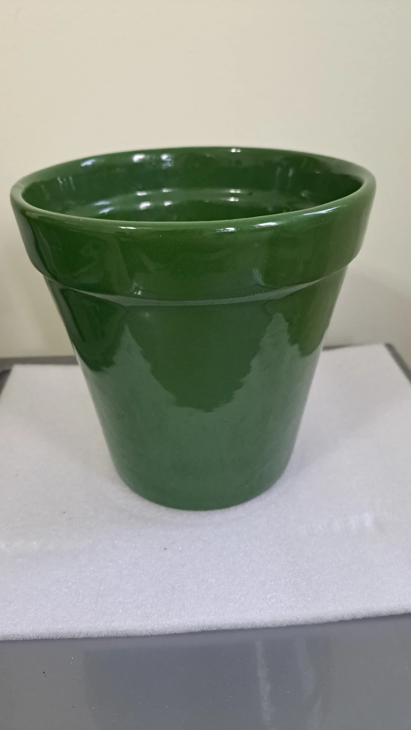 This is a green ceramic pot. It's a good size for small plants or herbs. The glaze is smooth and shiny.