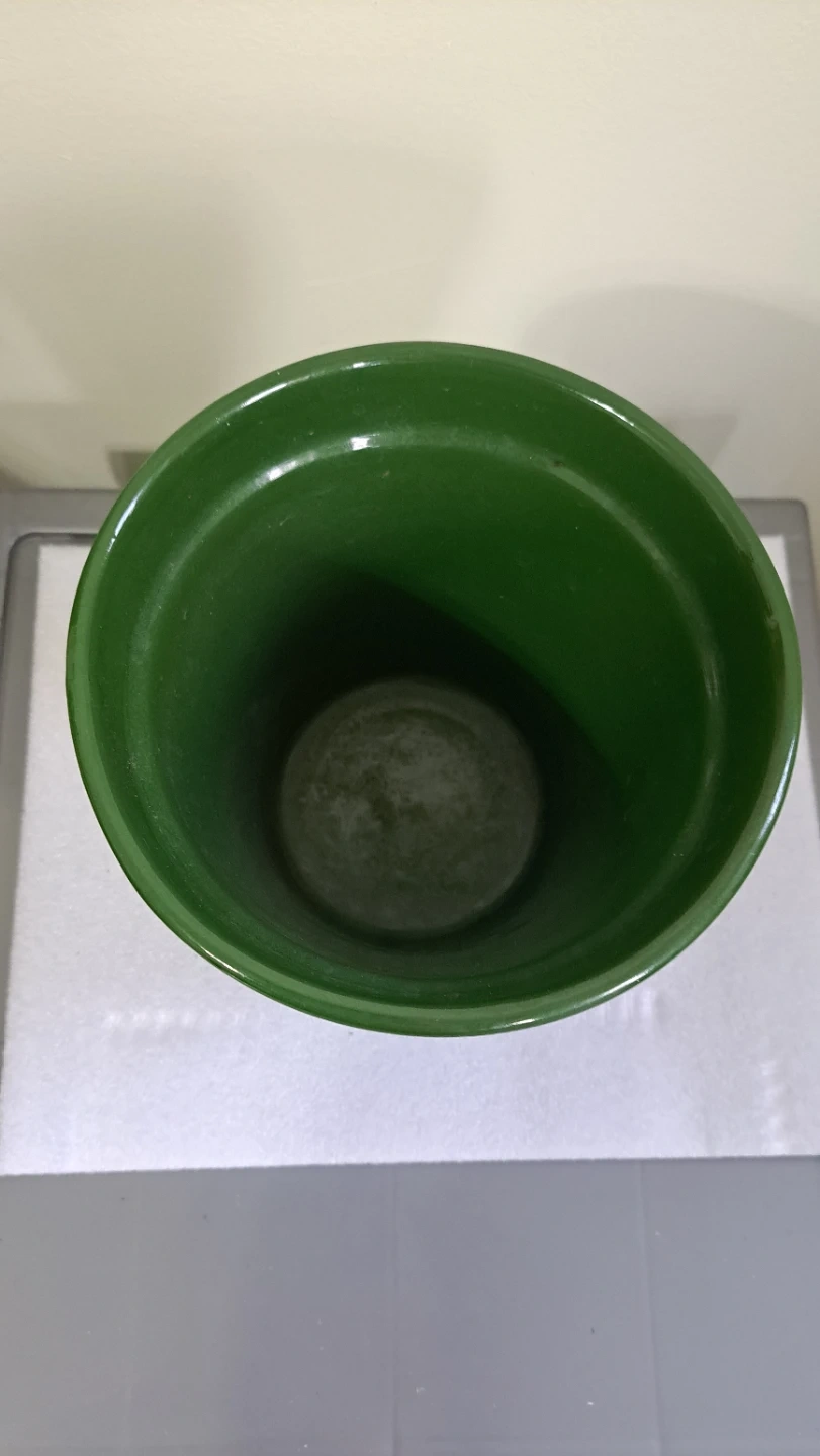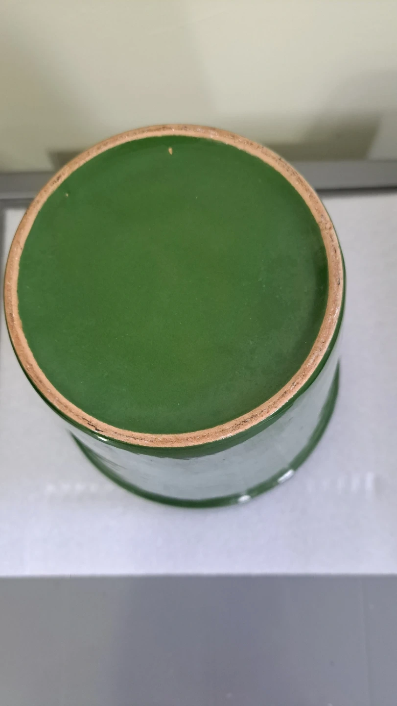 This is a green ceramic pot. It's a good size for small plants or herbs. The glaze is smooth and shiny.