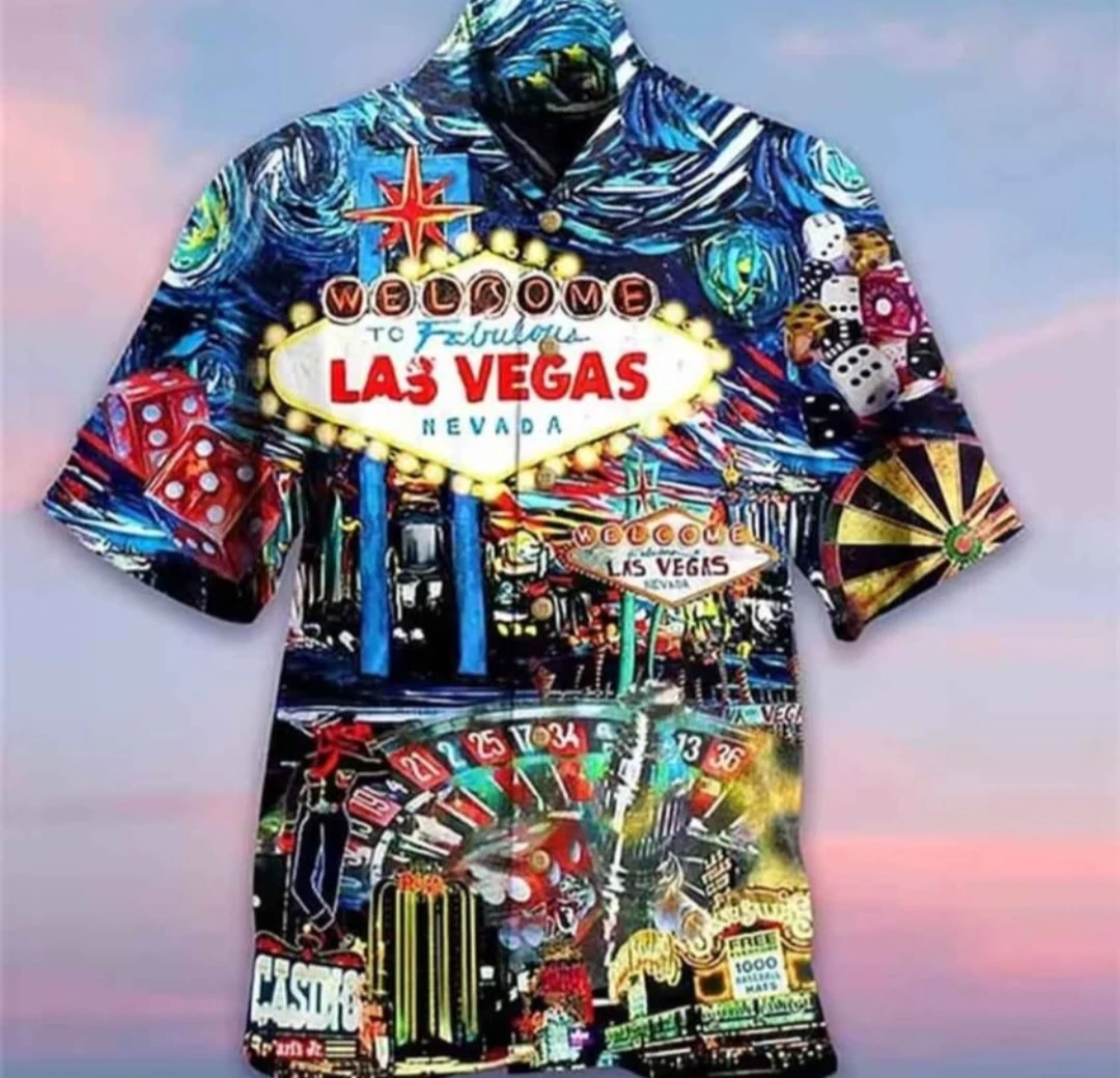 Features a vibrant "Welcome to Fabulous Las Vegas" graphic. Short-sleeved button-up style with a casino and dice print. Casual Hawaiian shirt.