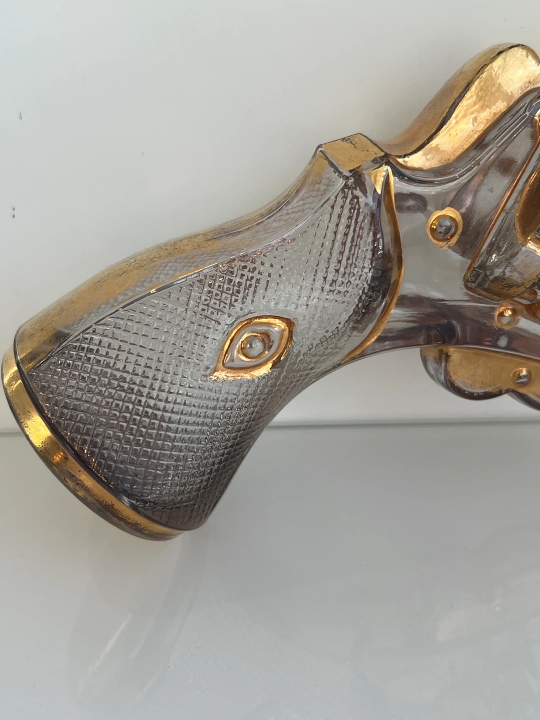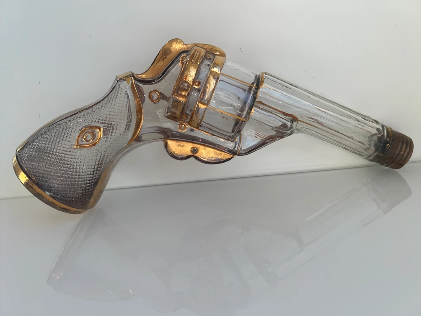 This unique glass decanter is shaped like a revolver, complete with gold-coloured trim. It's a statement piece for any bar. It's made of clear glass with detailed gold accents.