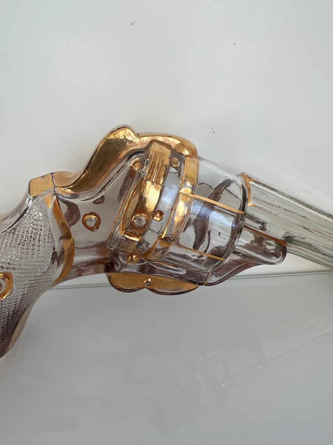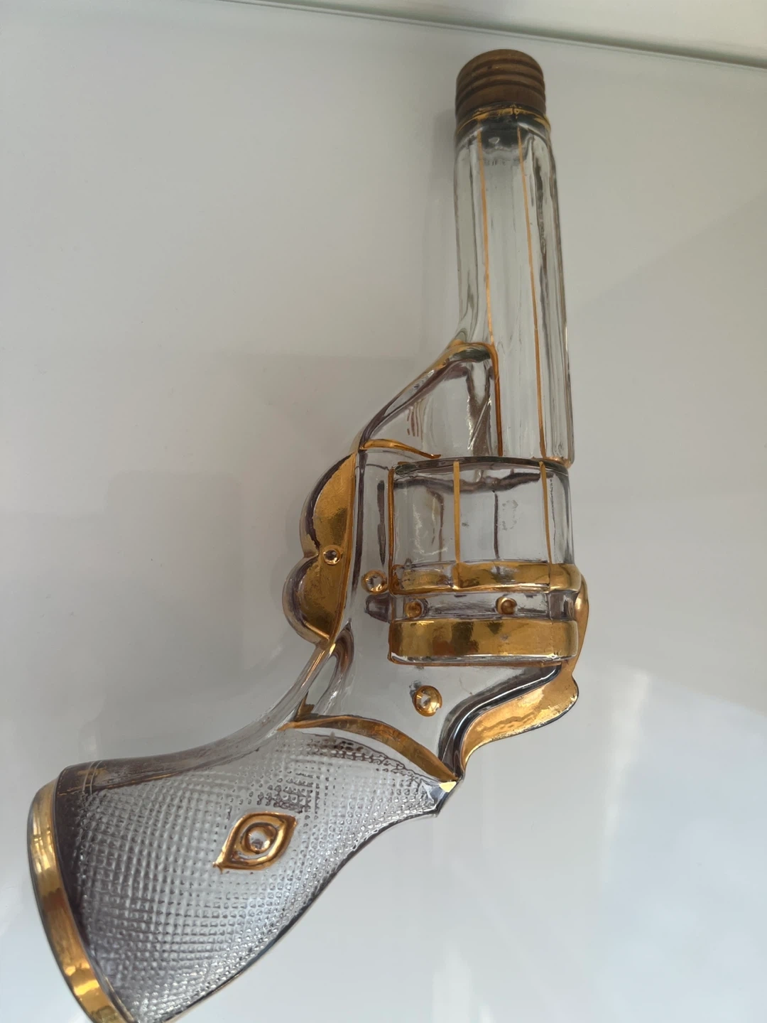 This unique glass decanter is shaped like a revolver, complete with gold-coloured trim. It's a statement piece for any bar. It's made of clear glass with detailed gold accents.