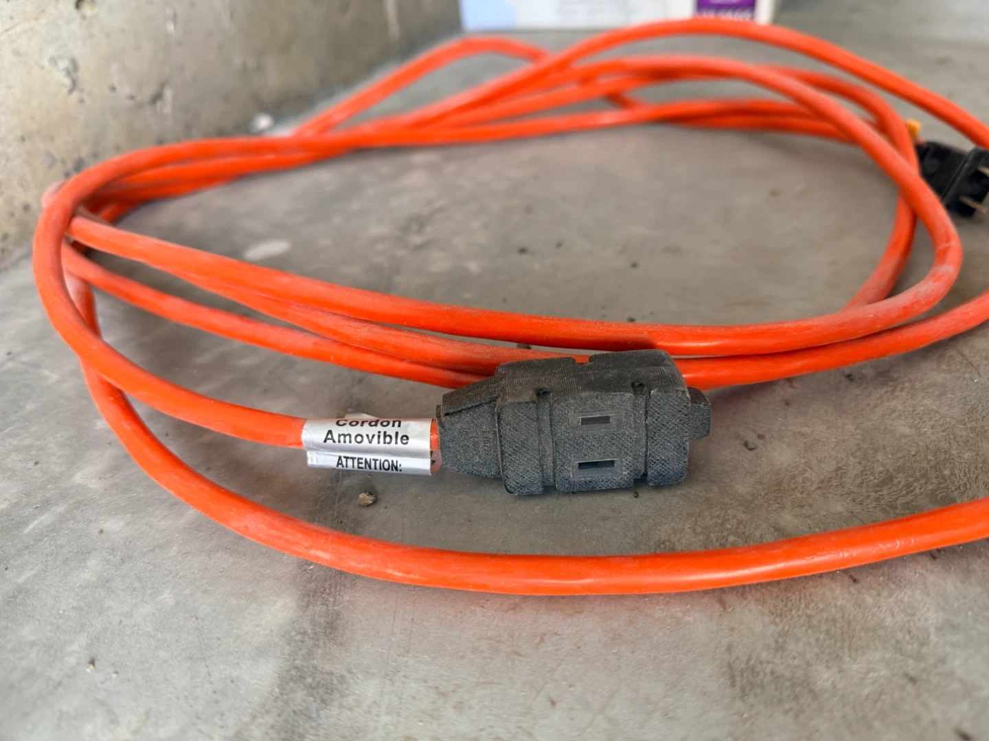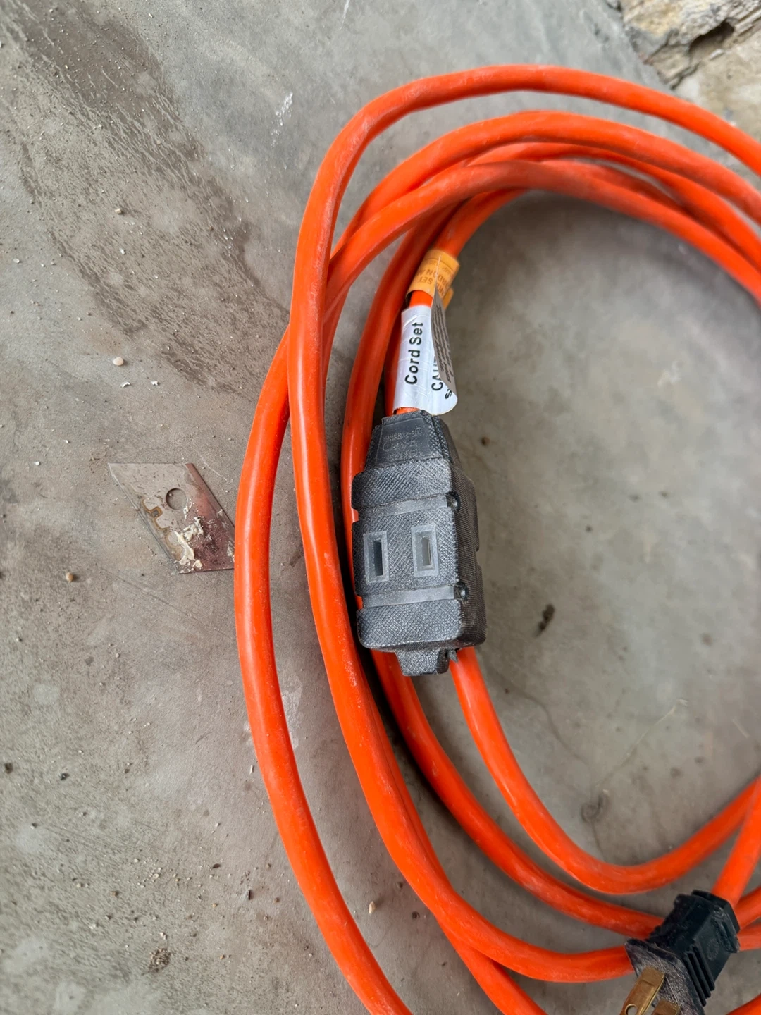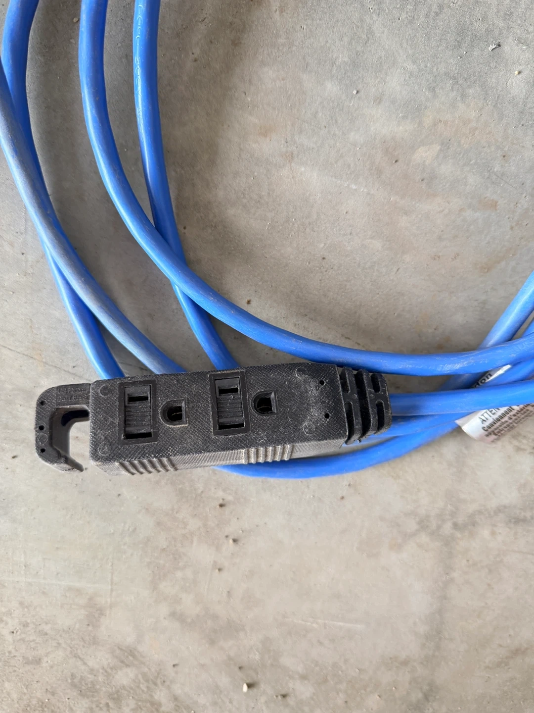 Three extension cords, two orange and one blue. All in good working condition and ready for use! These cords offer extra reach for tools or appliances.