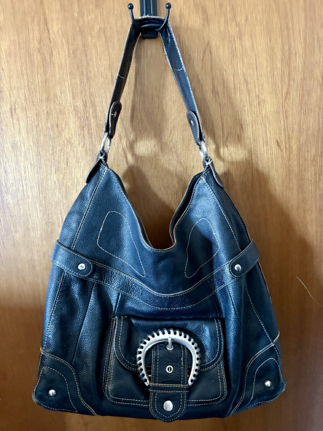 Large black leather hobo bag. Features silver-toned hardware and stitching accents. Multiple compartments. Stylish and functional.