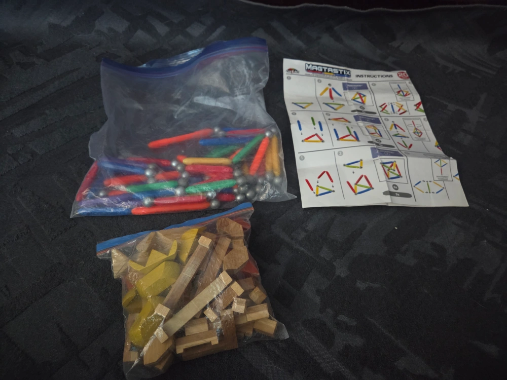 Magnetic building sticks and balls with additional wooden blocks for construction. Includes instructions.