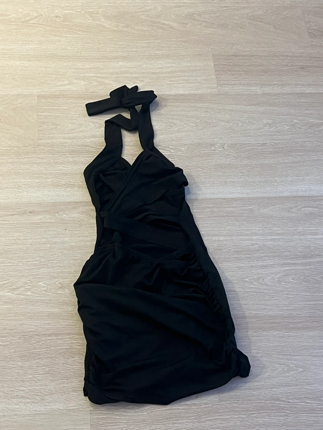 This black halter dress features a flattering wrap-style bodice and ruched detailing along the sides. The tie-neck closure offers adjustable fit. It's made from a stretchy, lightweight fabric.