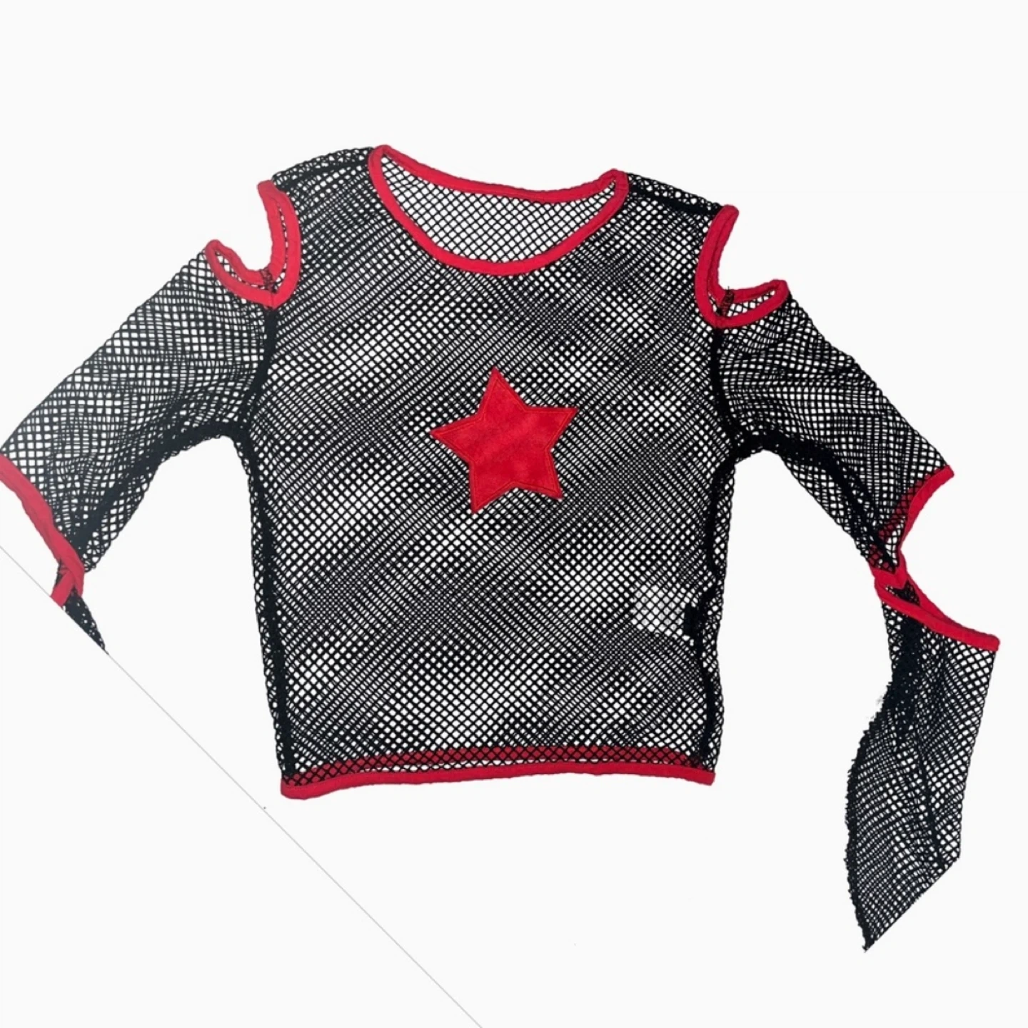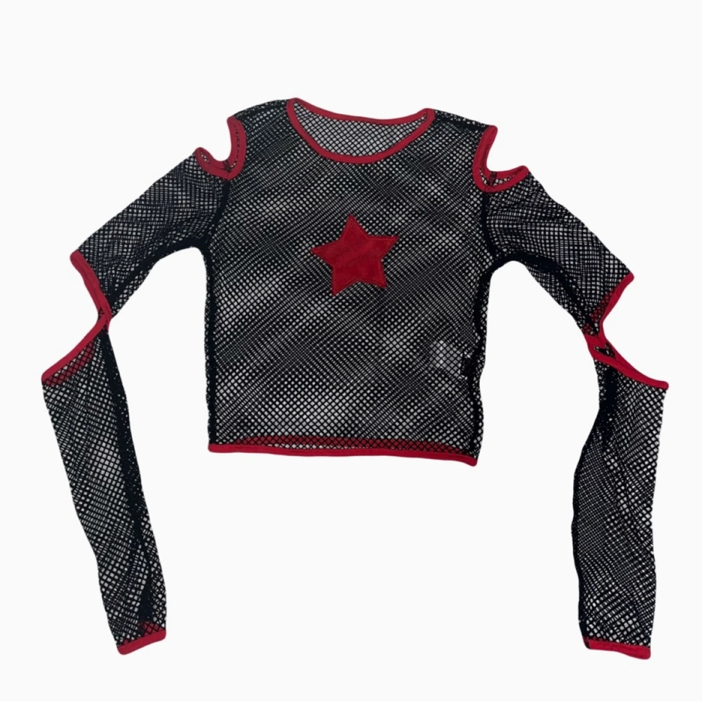 Selling a black mesh long-sleeve top with a red star on the front! It has a red trim and open shoulders. Size is S.