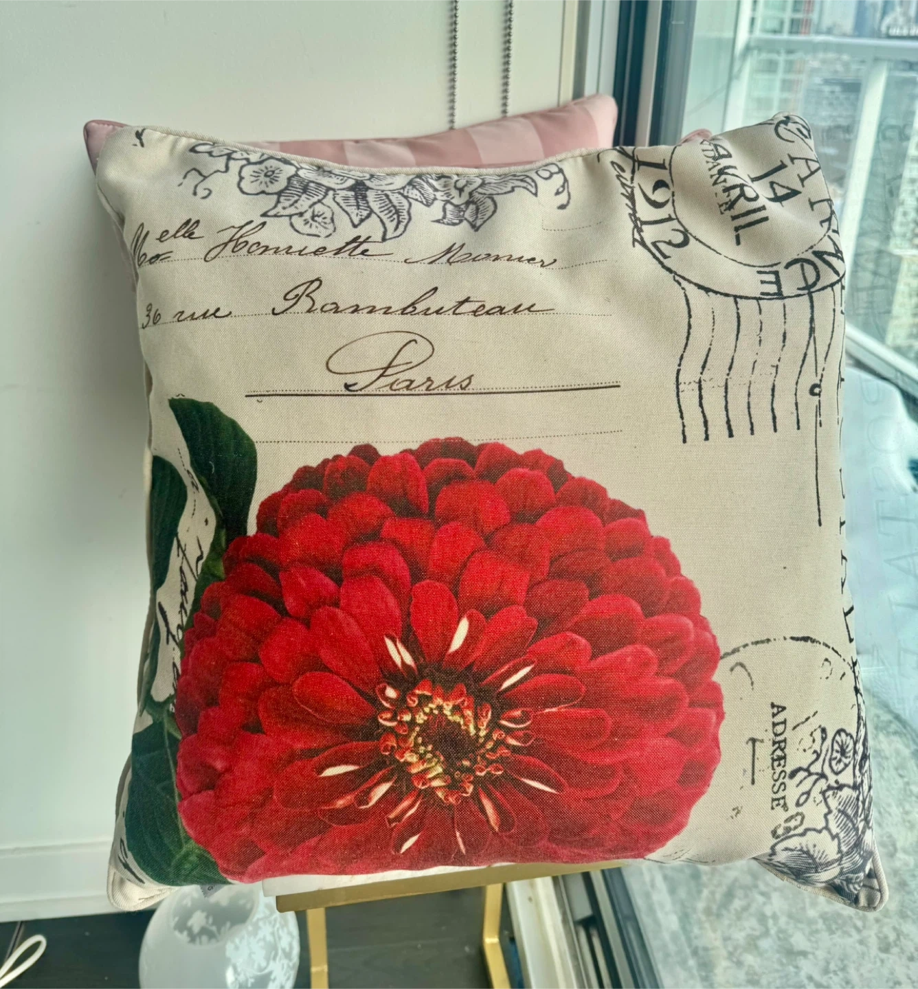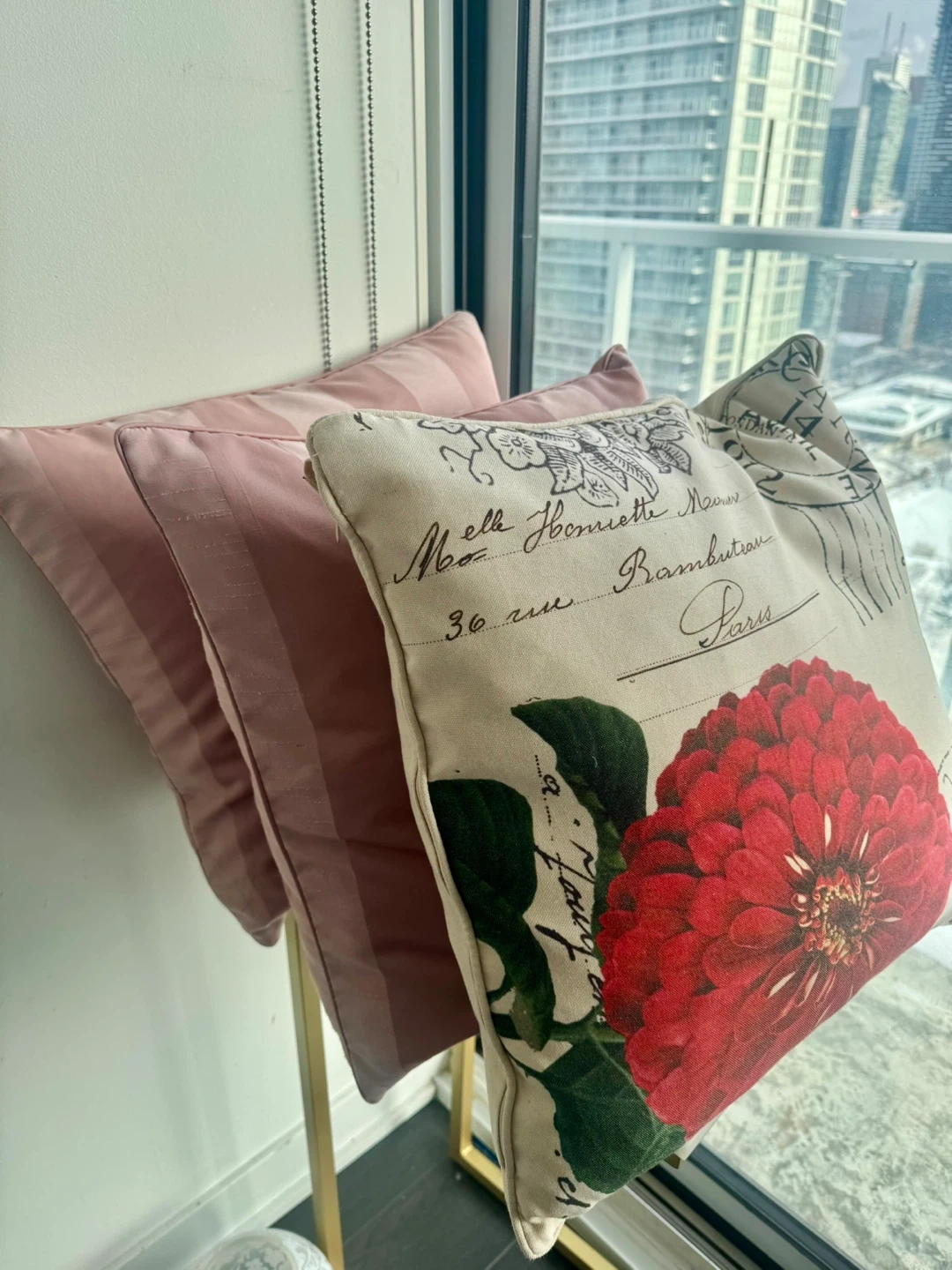 Includes 2 blush pink pillows and 1 beige pillow with a Parisian-style floral print.
