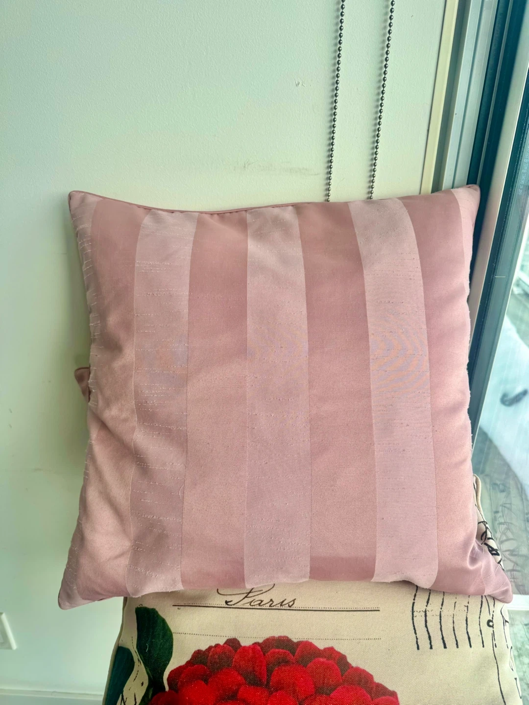 Set of three feather-filled decorative pillows in soft, romantic tones.