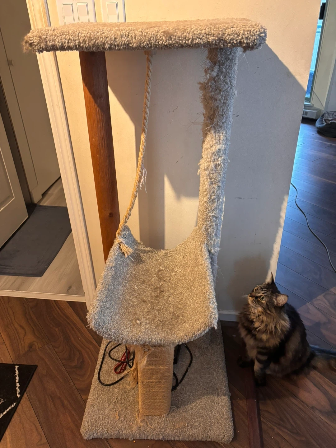 A multi-level cat tree with a plush carpet finish and a sisal rope scratching post. It includes a hanging ball toy for feline entertainment. Some wear and tear is visible from use.