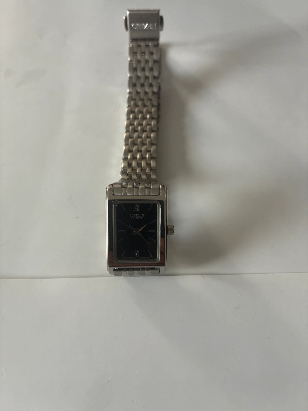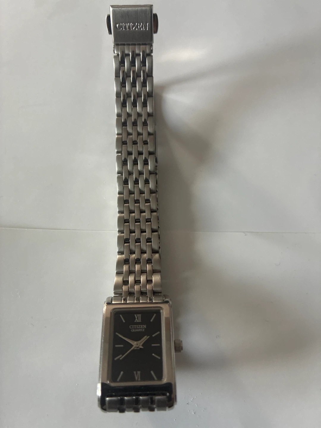 This is a Citizen Quartz women's watch. It features a silver-tone metal band and a black rectangular face with Roman numerals. It's a classic accessory for any outfit.