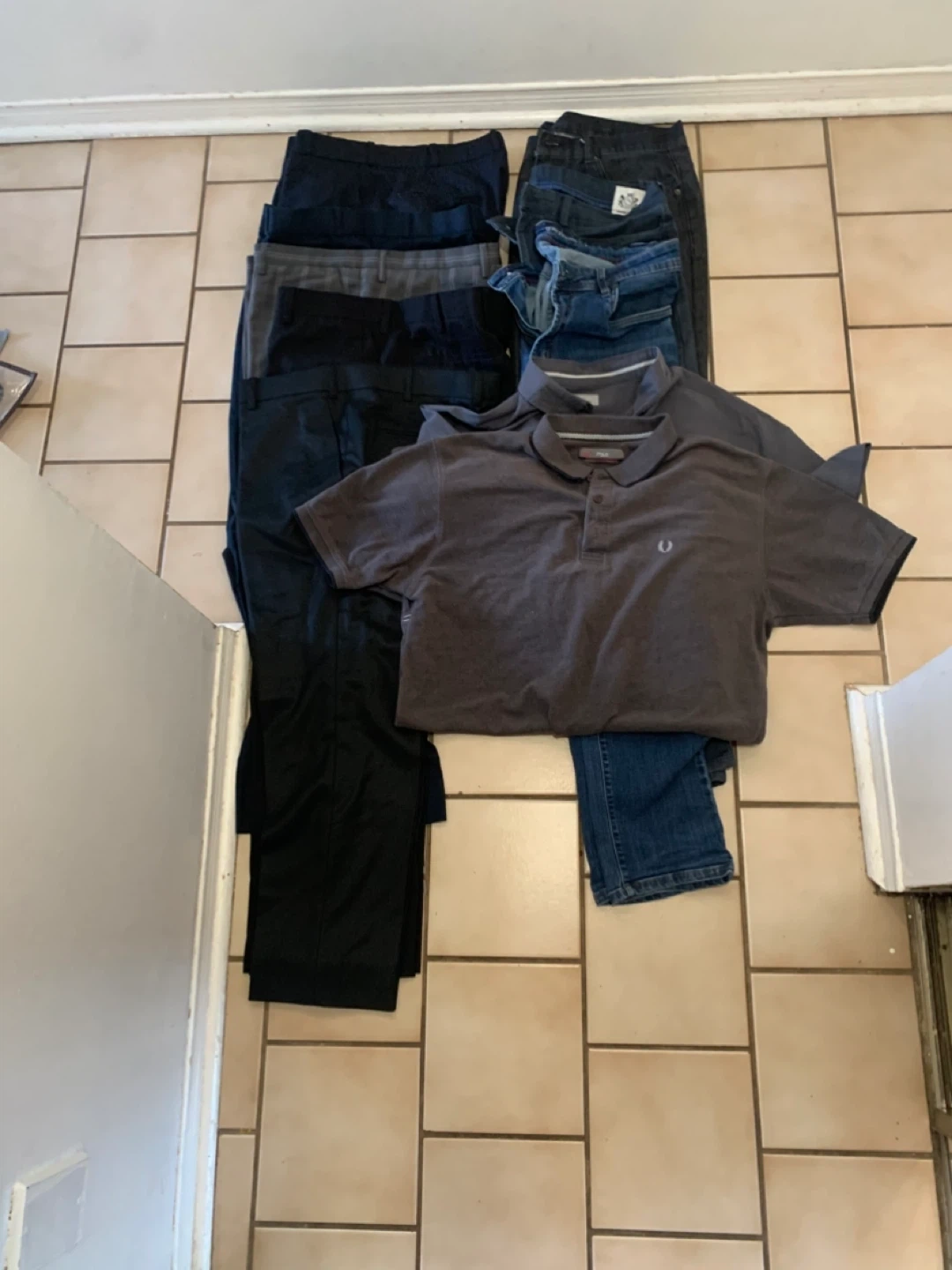 Bundle of men's clothing featuring a charcoal grey Fred Perry polo shirt and several pairs of pants. Includes a mix of dress pants and jeans. All items are for men.