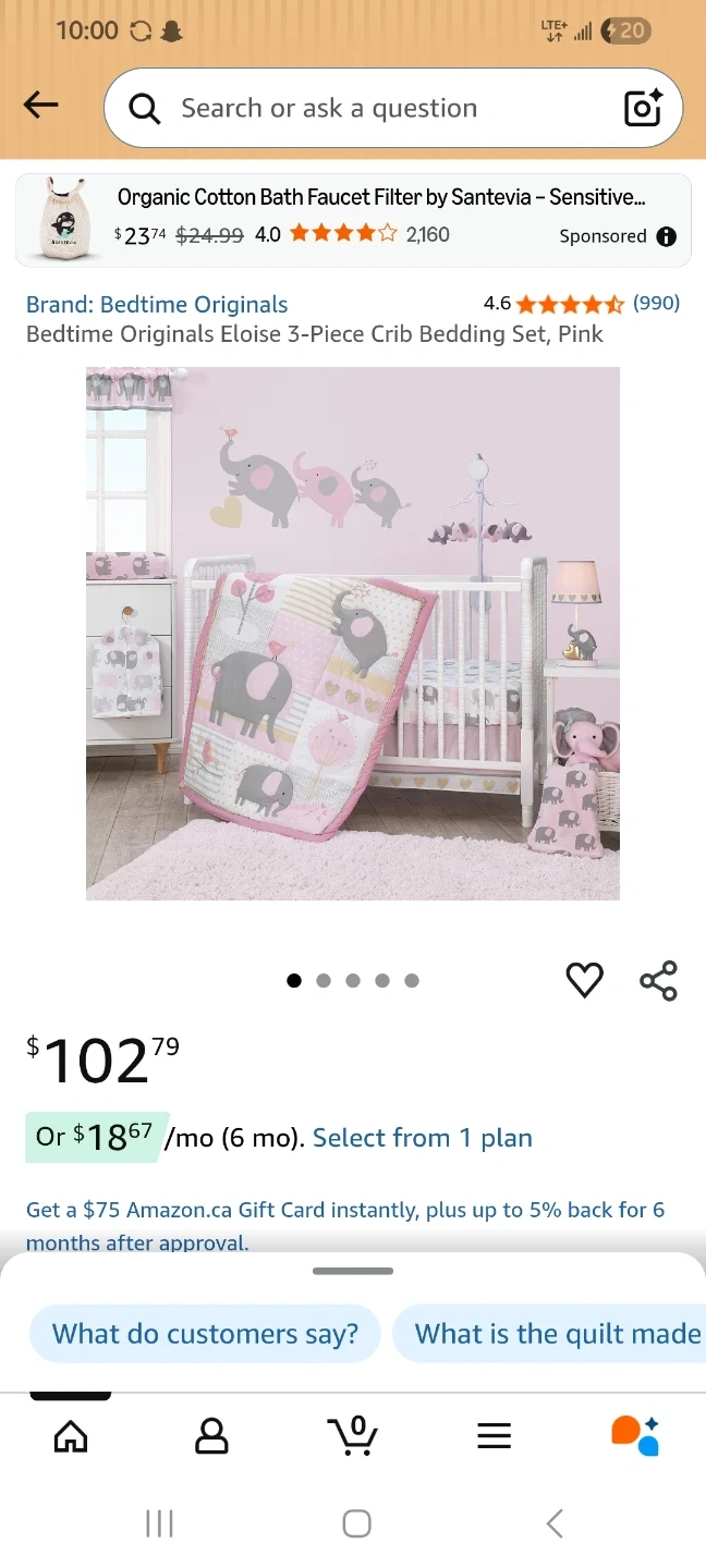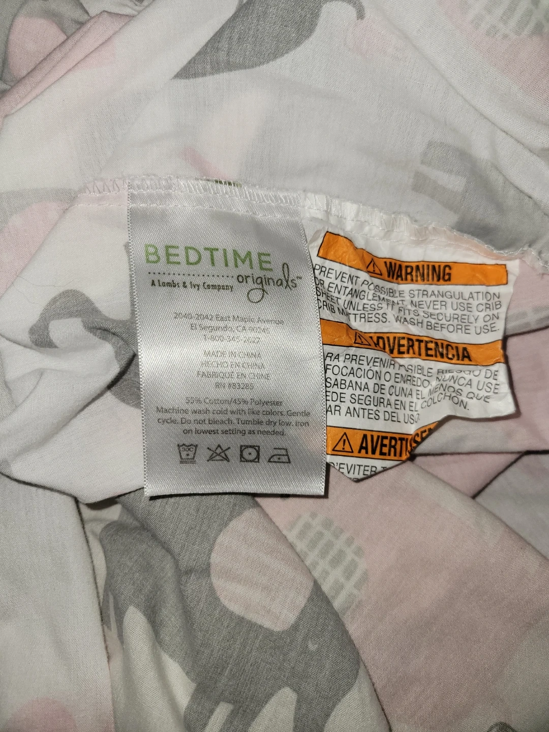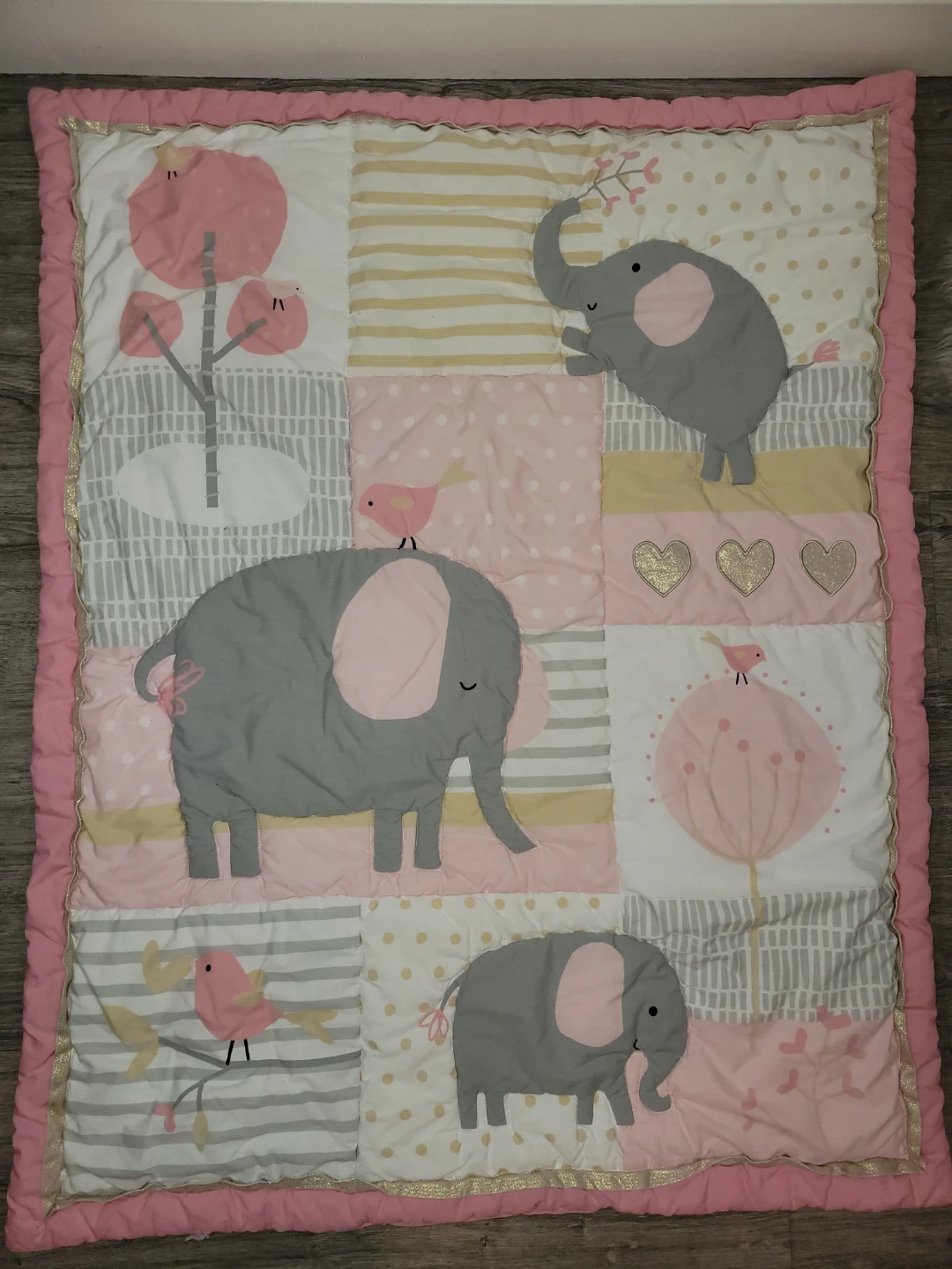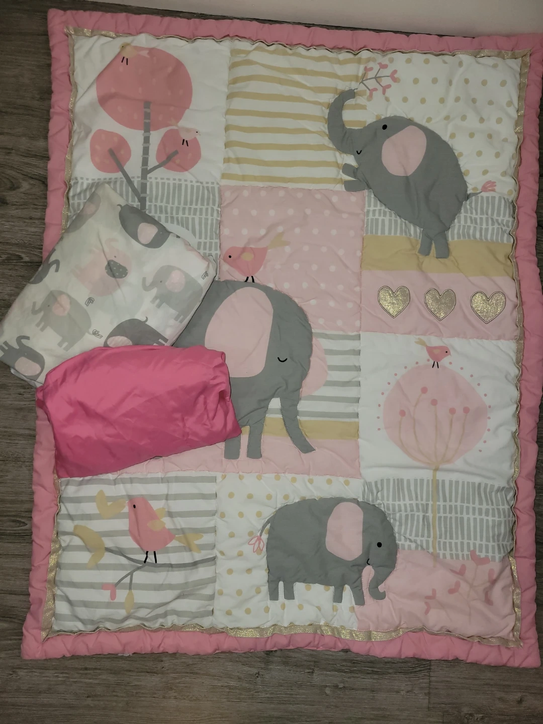 Adorable baby quilt and fitted sheet set features a sweet elephant and bird theme in pink, grey, and gold. Perfect for a nursery.
