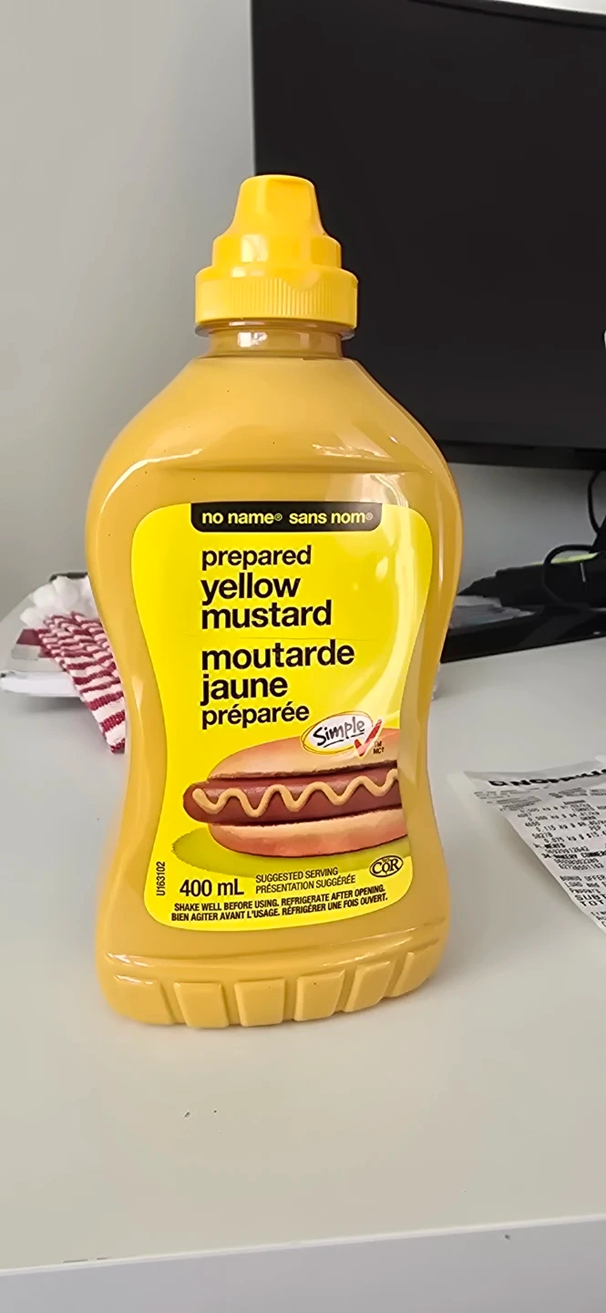 A 400mL bottle of No Name prepared yellow mustard. It's a staple for hot dogs and sandwiches. This mustard is great for everyday use.