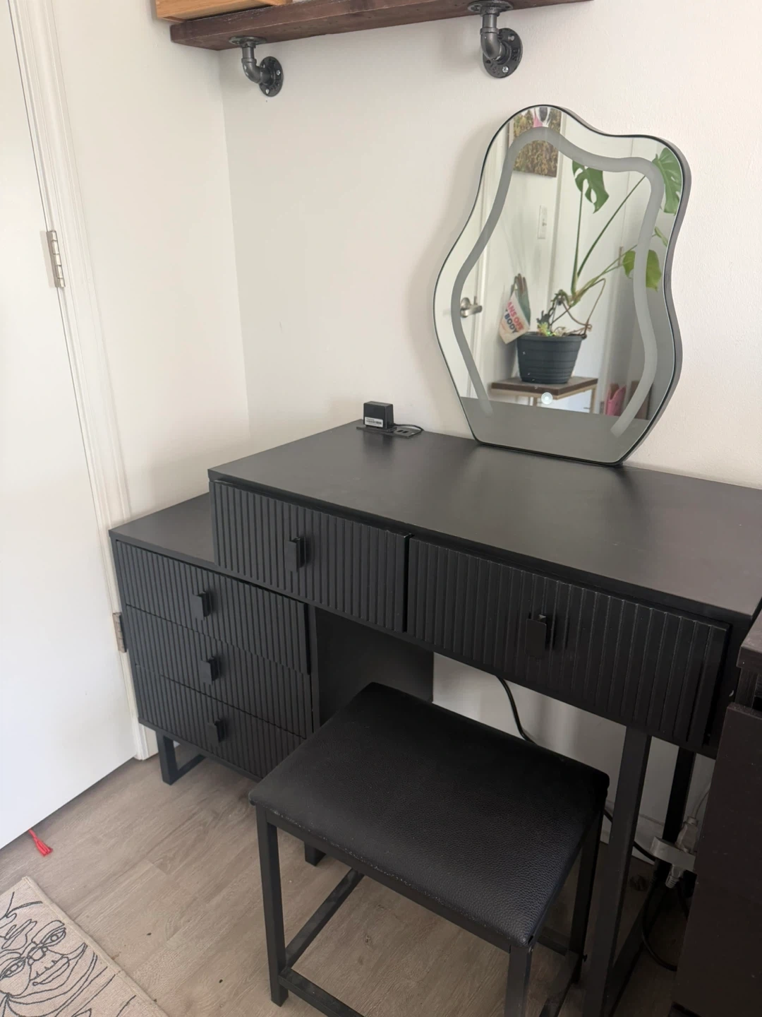 Selling a sleek black vanity desk set! It comes with a unique shaped mirror with LED lighting and a matching stool. The desk has 5 drawers for storage, electric outlets for charging, perfect for organizing your makeup and accessories. It's in great condition and ready for a new home!