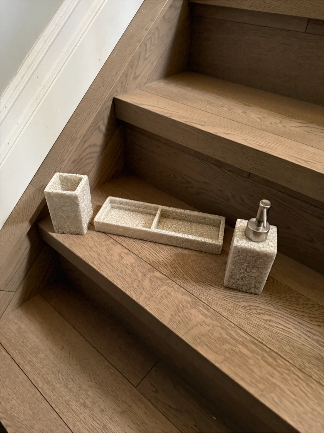 Selling a bathroom accessory set! Includes a toothbrush holder, soap dispenser, and tray. It's in great condition and would look lovely in any bathroom