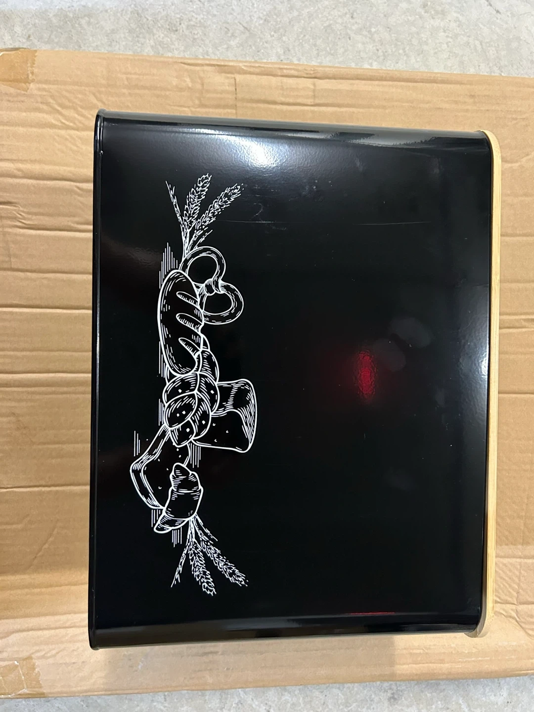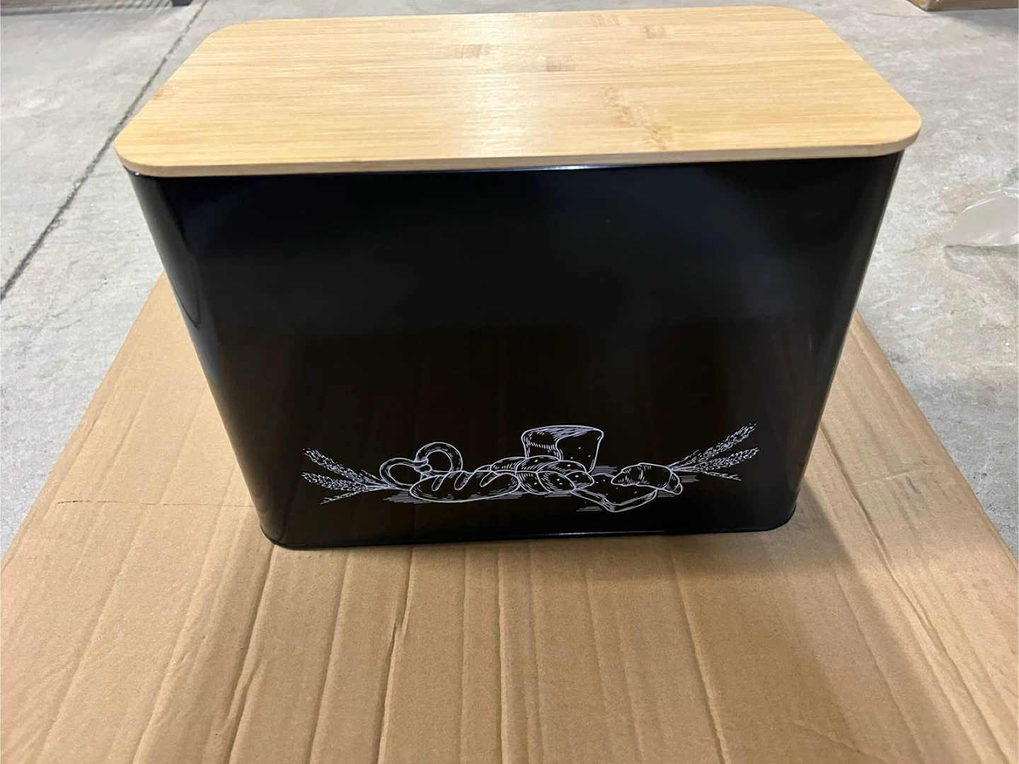 Selling a stylish black bread box, perfect for keeping your bread fresh. It features a bamboo lid and a cute bread-themed design on the front. A great addition to any kitchen!