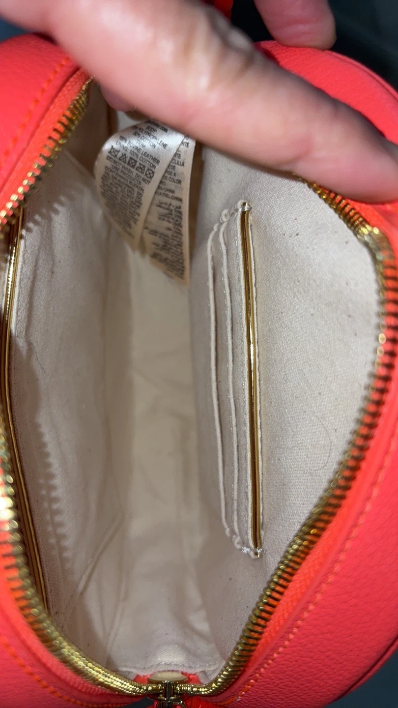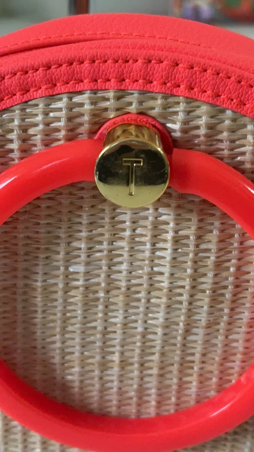 This is a fun round crossbody bag from Ted Baker. It features a woven straw body with neon pink leather trim and a detachable crossbody strap. The bag has a zip closure and a decorative ring detail on the front. It's perfect for adding a pop of colour to any outfit!