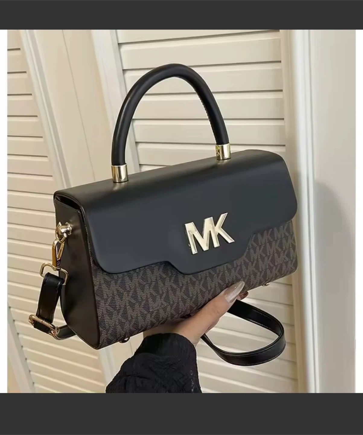This Michael Kors satchel is in great condition and ready for a new home! It features a black top with the MK logo in gold, and a brown patterned bottom. It also has a top handle and a shoulder strap.