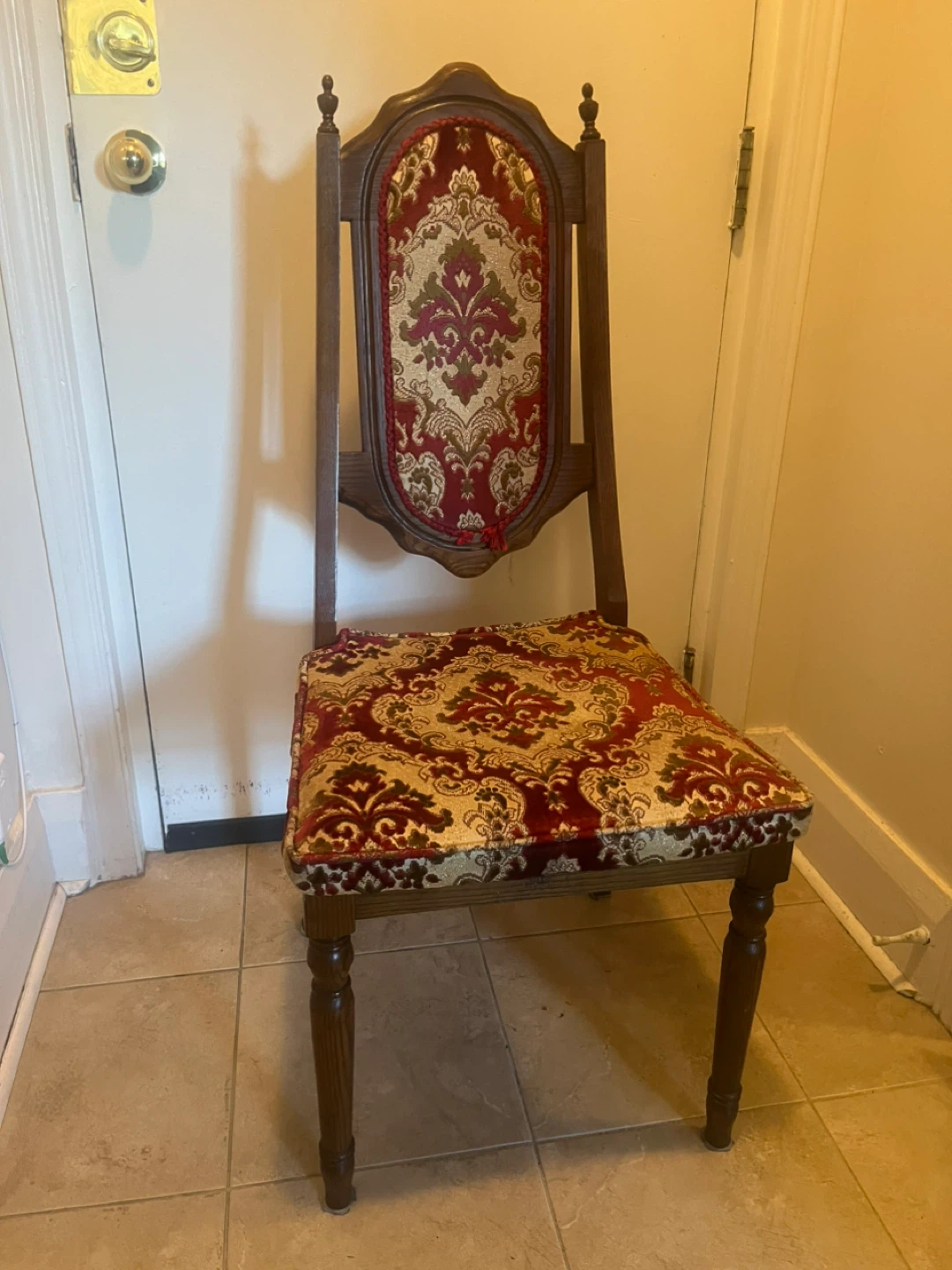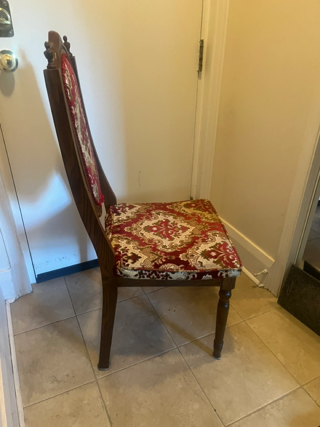 6 solid wood chairs and 2 matching arm chairs for the head of the dining table. In great condition as is or perfect for reupholstering or painting. 8 in total.