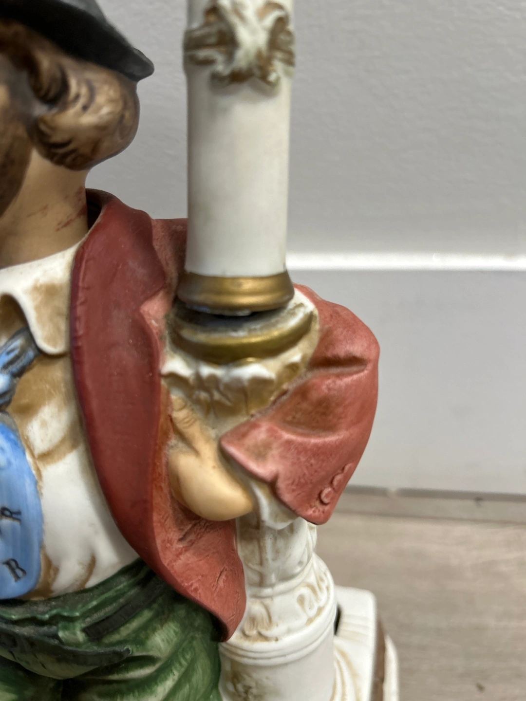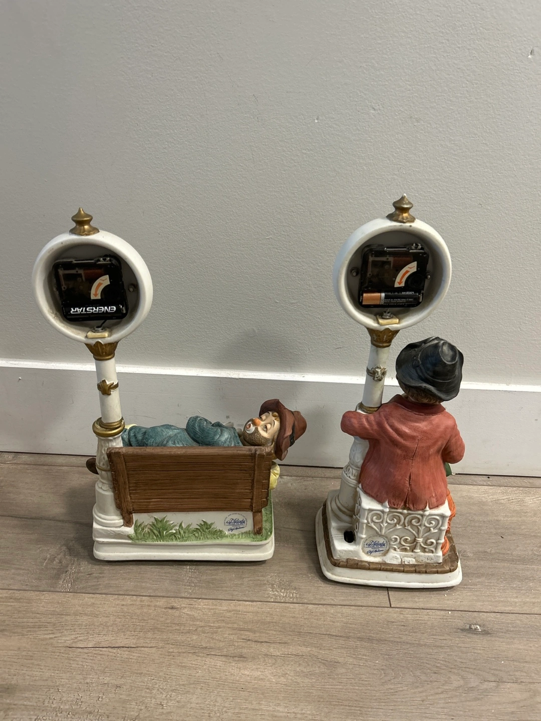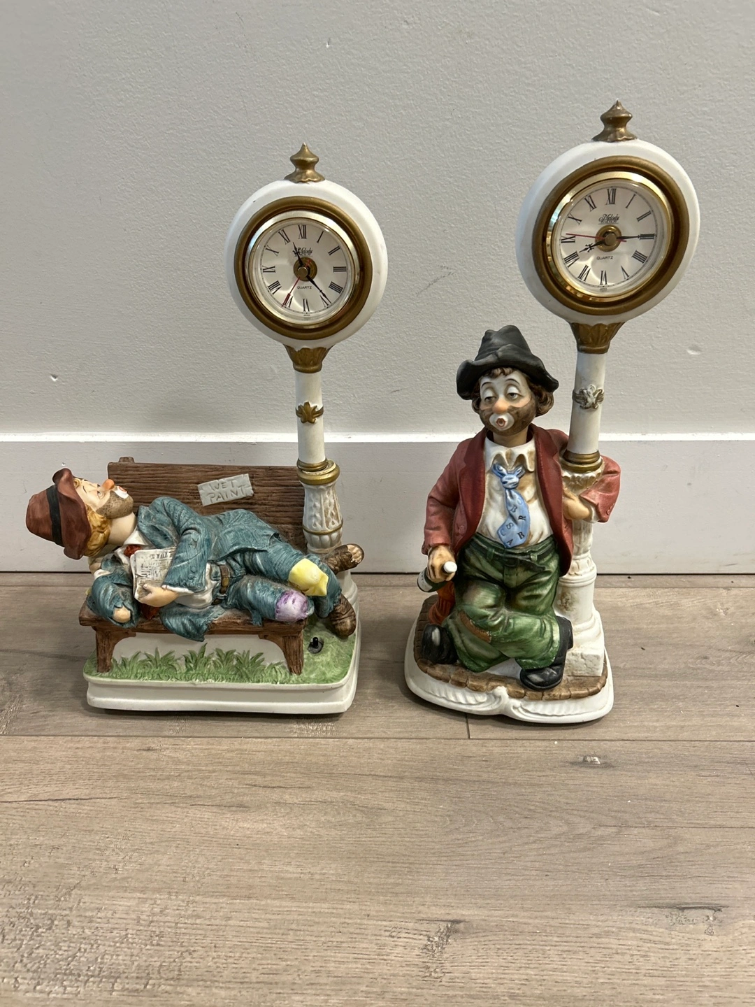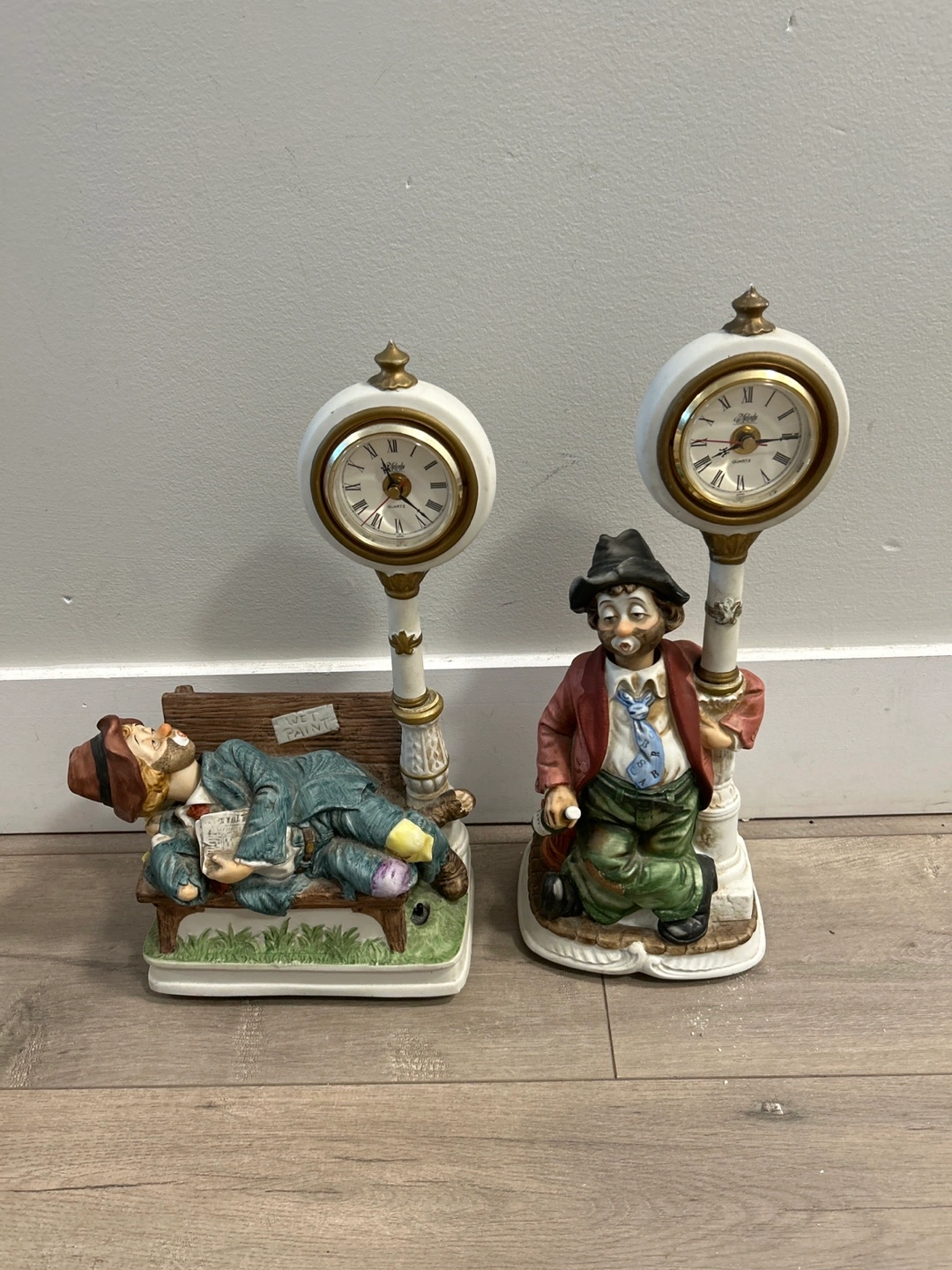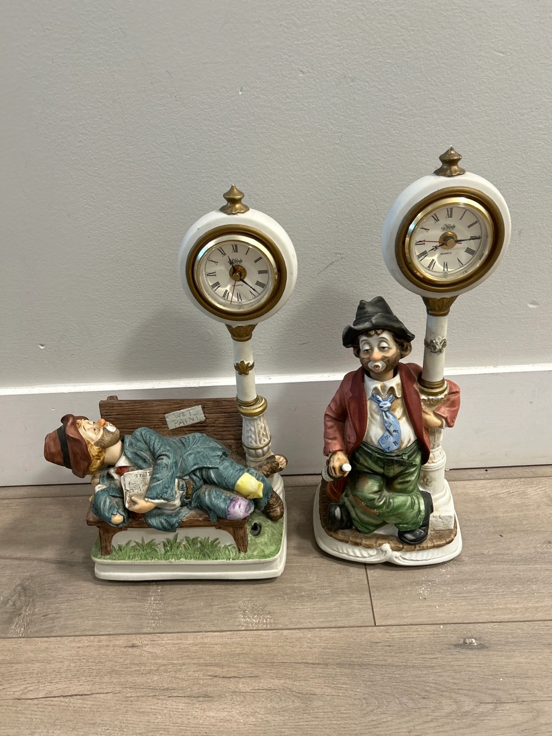 Two vintage figurine clocks, one of a clown and the other of a hobo sleeping on a bench. Both have a clock face on top of a white post. The musical part needs repair. The one standing broken as shown in the picture, but still connected.Selling as is.