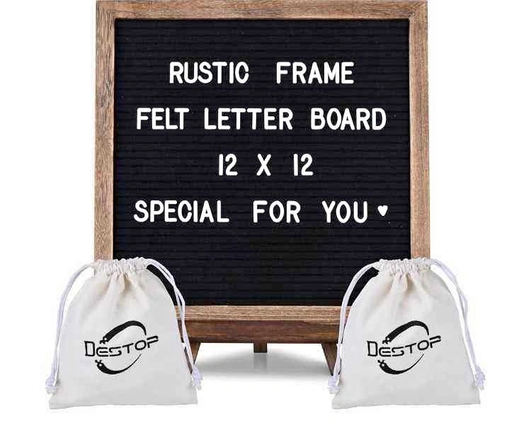 Felt Letter Board with Rustic Frame and Stand, 12x12 inch. Changeable letter and message board. Includes 470 precut letters, numbers, symbols, hook to hang, and 2 canvas bags. MSRP: $29.95.