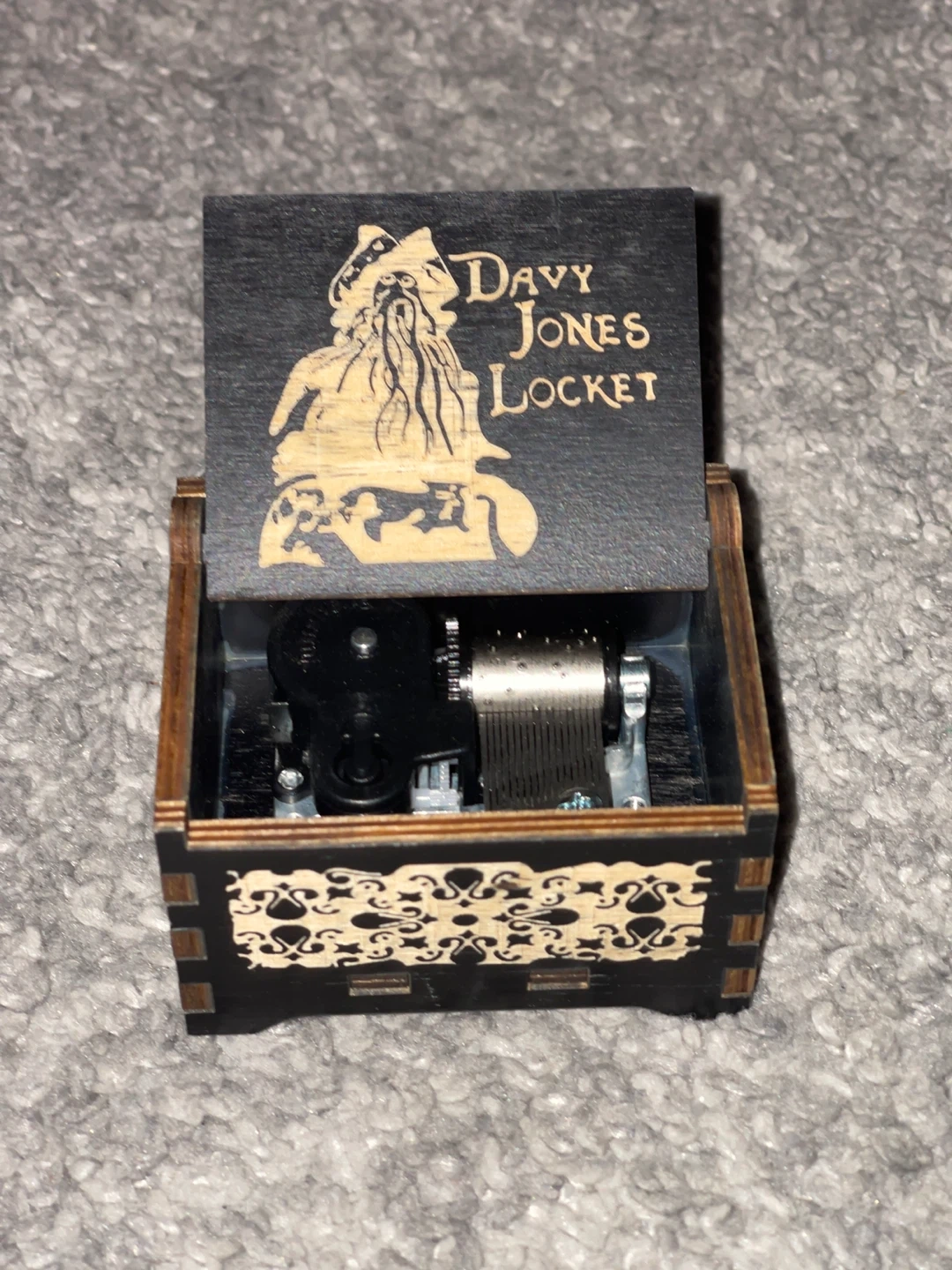 This music box features a 'Davy Jones Locket' design with decorative wood carvings. It contains a music mechanism with a cylinder and comb for playing music.