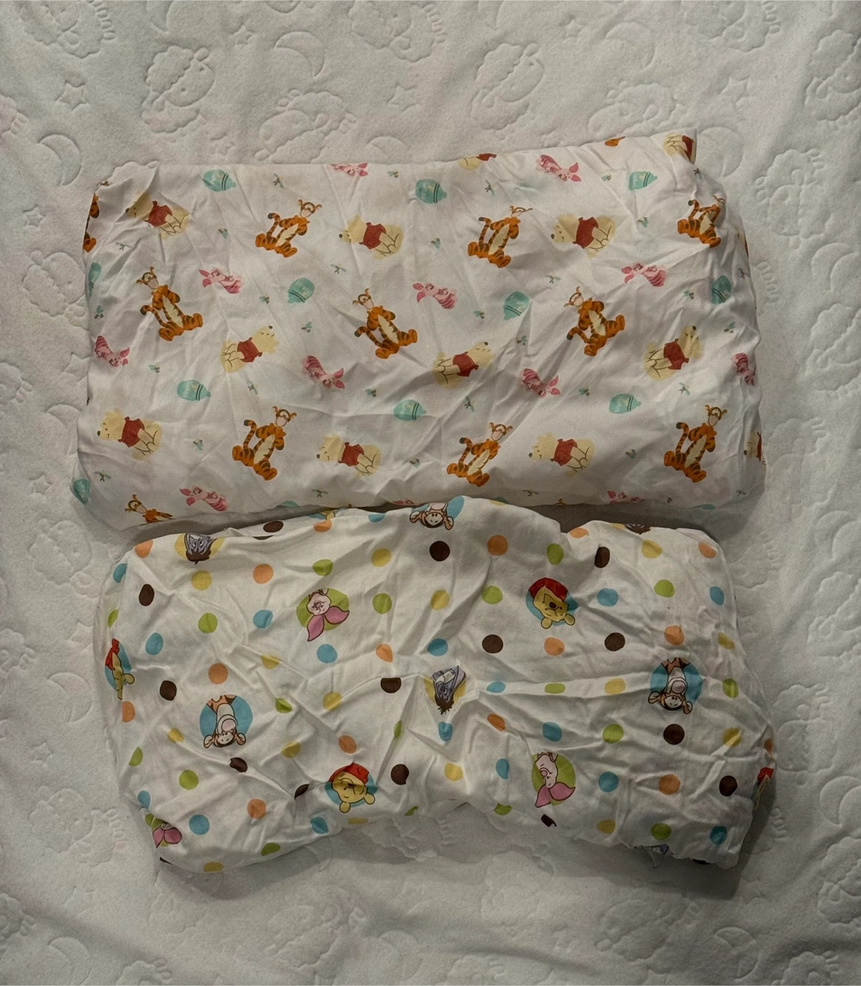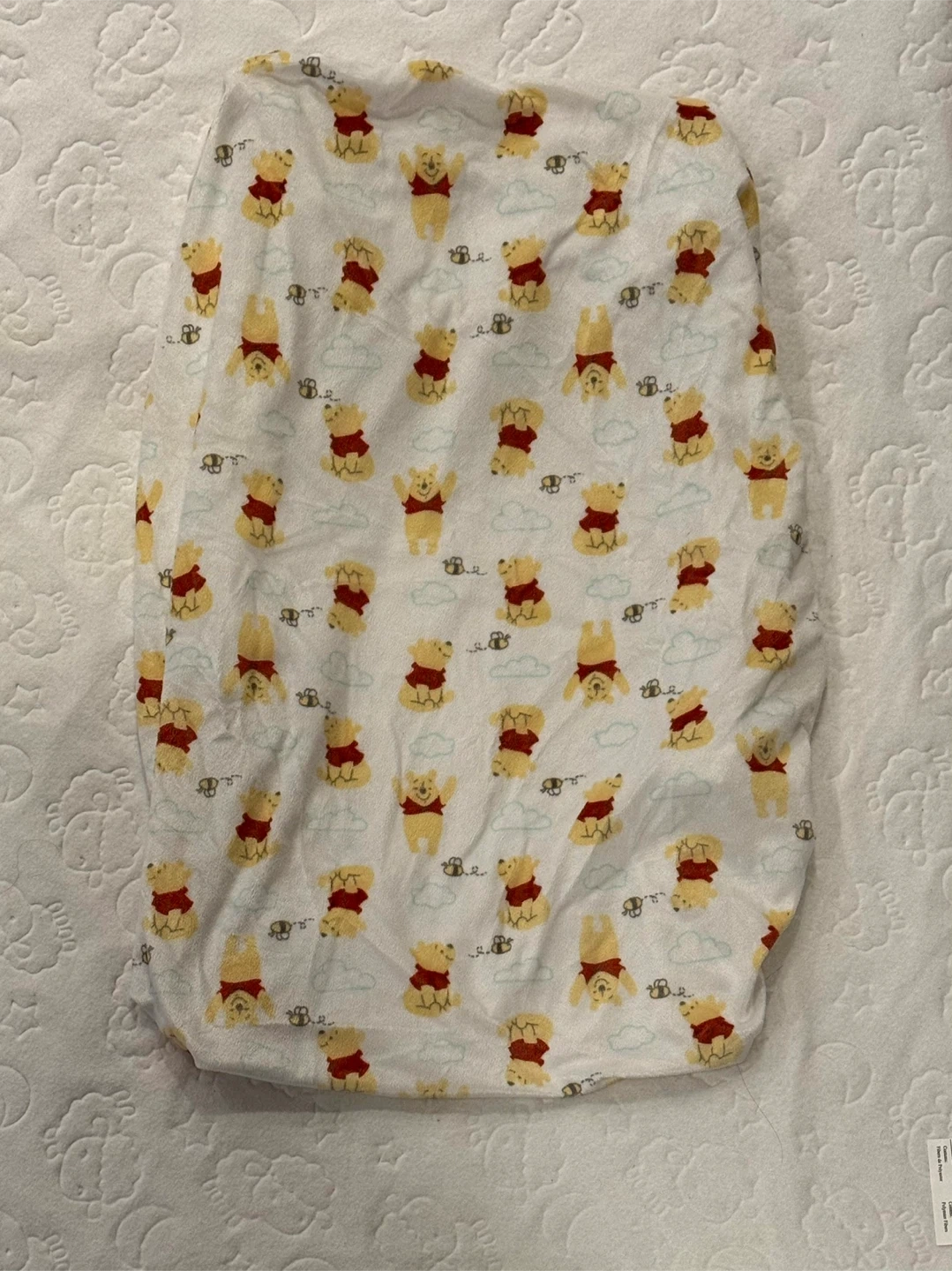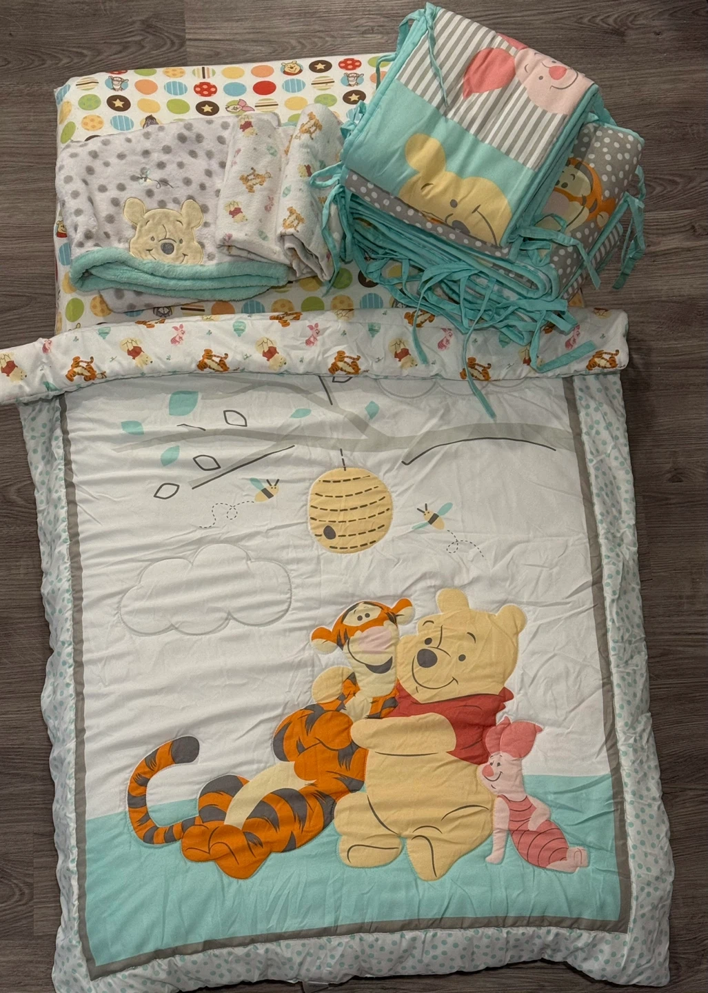 A sweet Winnie the Pooh themed crib bedding set! Includes a comforter, 3 fitted sheets, 2 wrapping blankets, a throw and crib bumpers featuring Pooh, Tigger, and Piglet. Total of nine pieces! Perfect for creating a cozy and adorable nursery for your little one! (I’m throwing in a Winnie the Pooh change pad cover, check the last photo! Thank you!)
