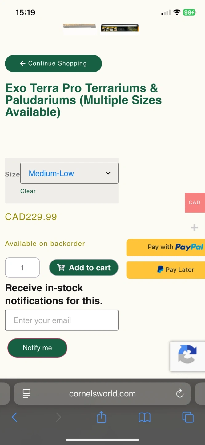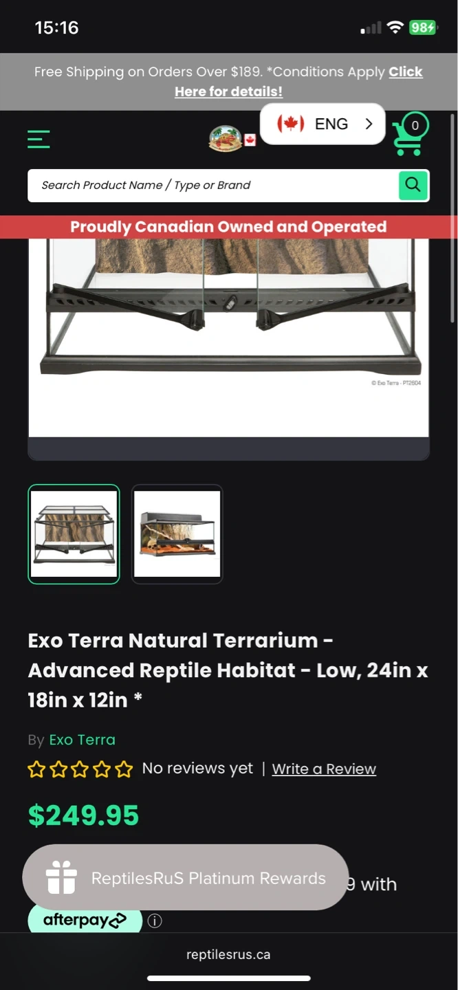 Exo Terra Glass Terrarium in Medium-Low size. This terrarium is designed for reptiles. It's made of glass with a front-opening door. Dimensions are 24in x 18in x 12in.