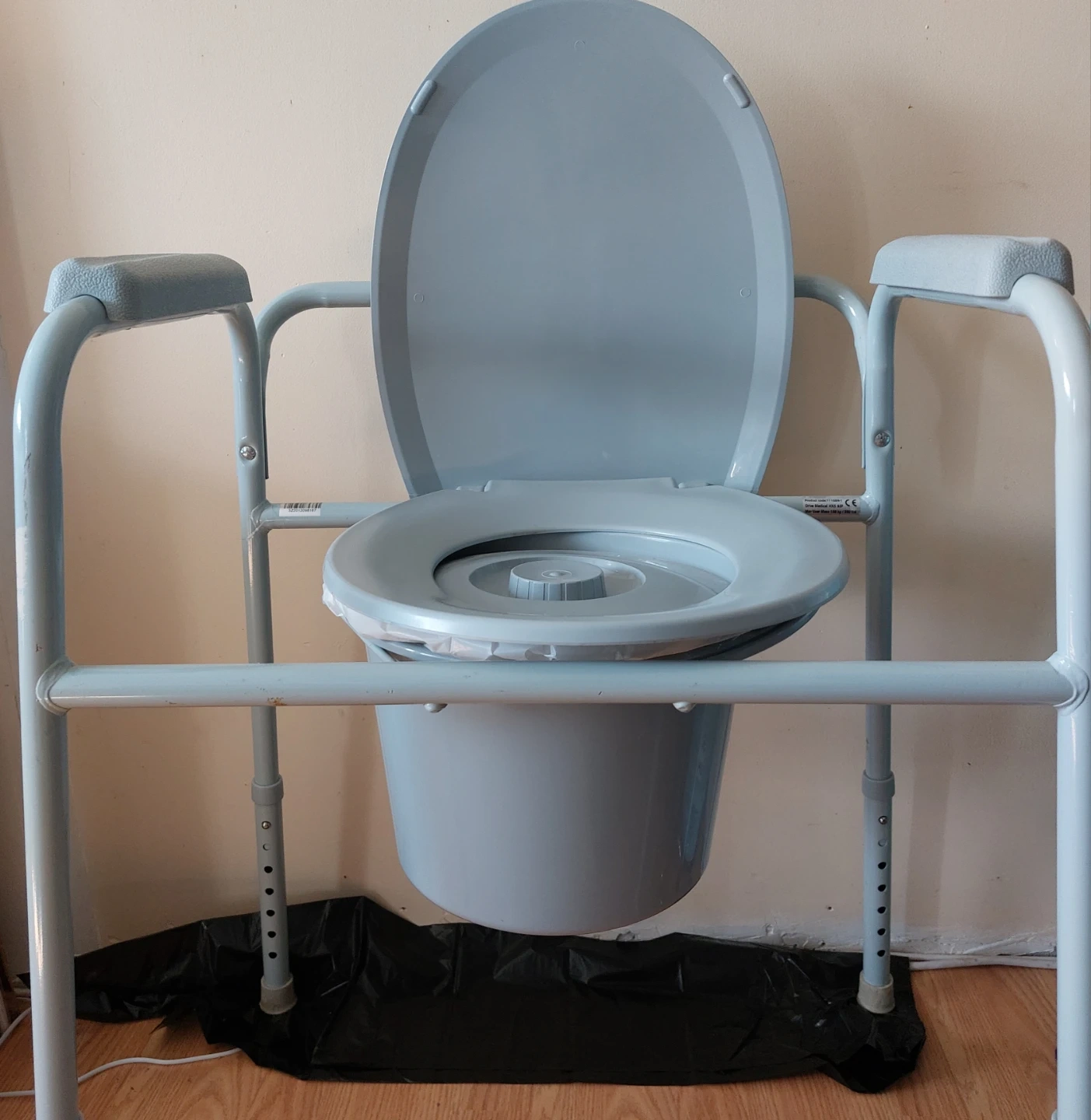 This commode chair is designed for comfort and stability. It features padded armrests and a removable splash guard for easier cleaning. The seat height is adjustable to suit different user needs. It's a useful aid for individuals requiring assistance with mobility.